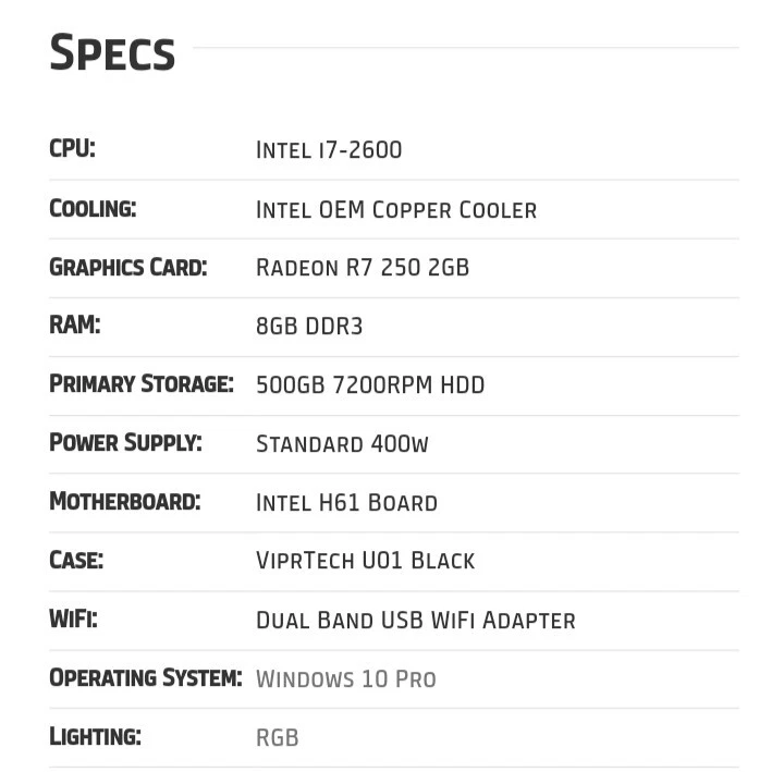 Maximum RAM Capacity: 2 GB SSD Capacity: N/A Most Suitable For: Casual Computing, Gaming, Office Form Factor: Mid Tower Country/Region of Manufacture: China Processor: Intel i5-650 gtin13: Does not apply Connectivity: HDMI, Micro-HDMI, USB 2.0, USB 3.0 Operating System: Windows 10 Pro Storage Type: HDD (Hard Disk Drive) Color: Black GPU: AMD Radeon RX580 Graphics Processing Type: Dedicated Graphics Motherboard Model: Intel 1st GEN Board Features: Tempered Glass Side Panel Processor Speed: 3.6 GHz, 3600 MHz UPC: Does not apply Hard Drive Capacity: 1TB HDD RAM Size: 8GB DDR3 Type: Desktop Operating System Edition: Windows 10 Screen Size: None MPN: Does Not Apply Product Line: ViprTech Brand: ViprTech Model: I5-R7-8G-1T