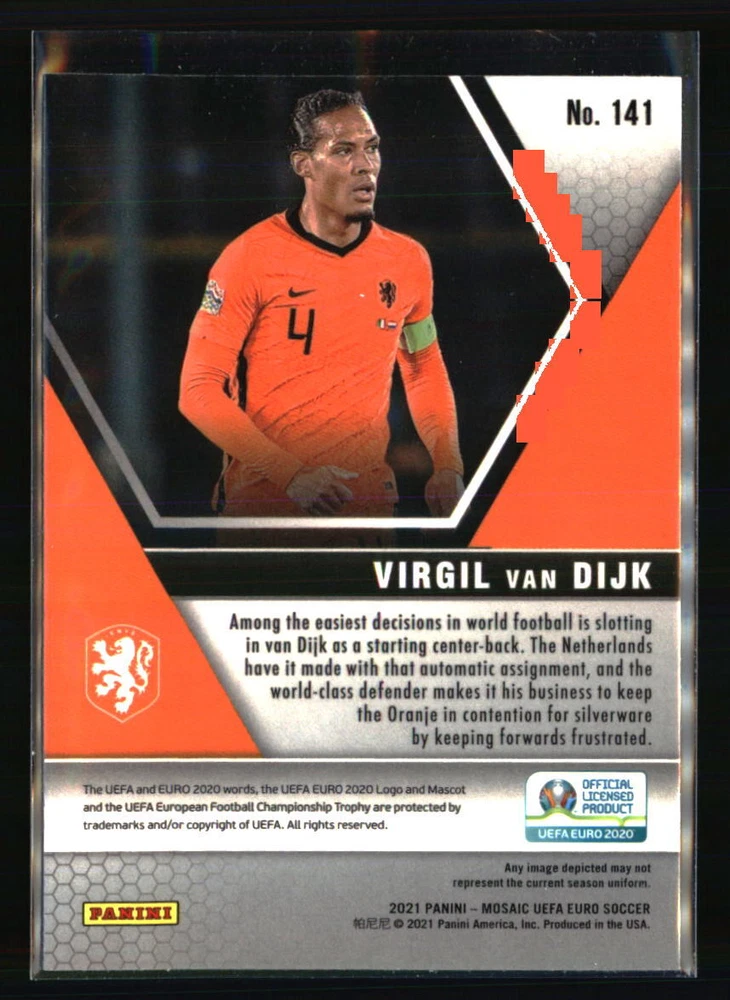 Year Manufactured: 2021 Season: 2021 Set: 2021 Panini Mosaic UEFA EURO 2020 Player|Athlete: Virgil van Dijk Graded: No Card Number: 141 Type: Sports Trading Card Team: Netherlands Sport: SOCCER Autographed: No Manufacturer: Panini