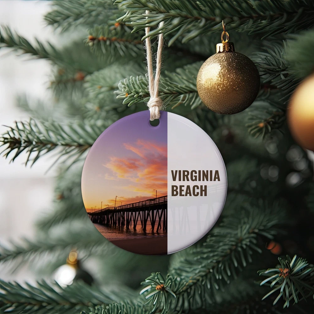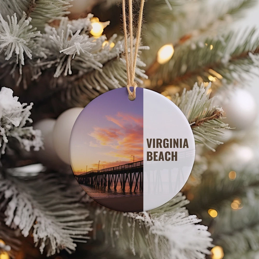 Virginia Beach Christmas Ornament Christmas Gift Virginia Beach Gift Virginia Beach Travel Christmas Decor Virginia Beach Souvenir Material: Ceramic Color: White Shapes: Circle, star, heart and oval Can be printed on both sides Imprint full-color artwork, photos, or logos Hole for hanging string and hanging string included Printed in the USA
