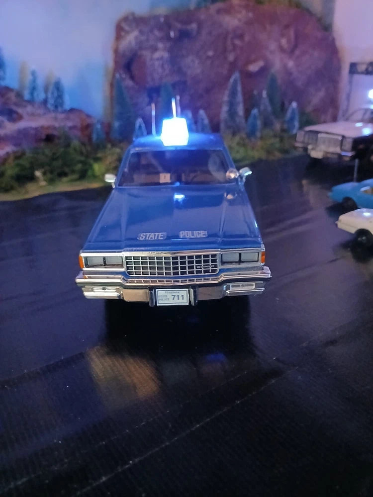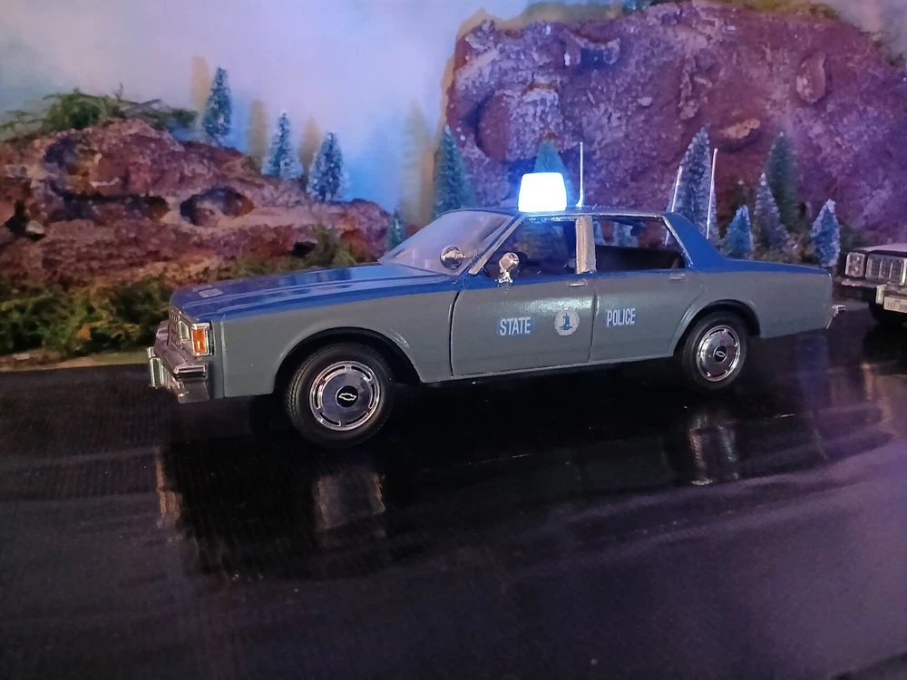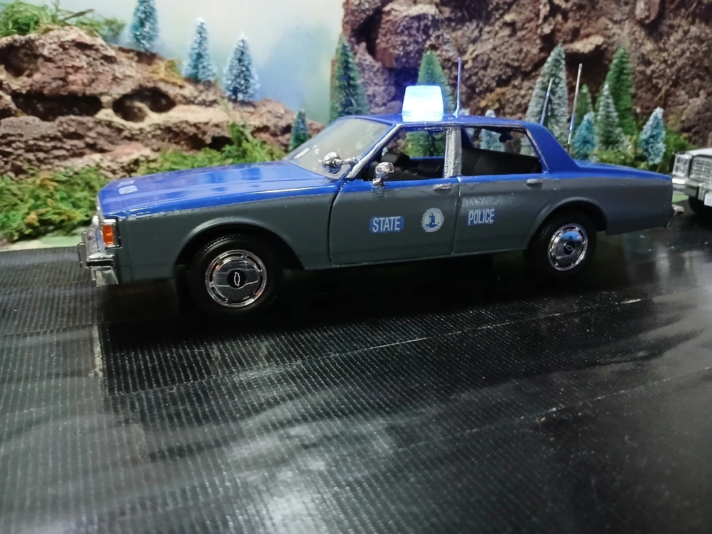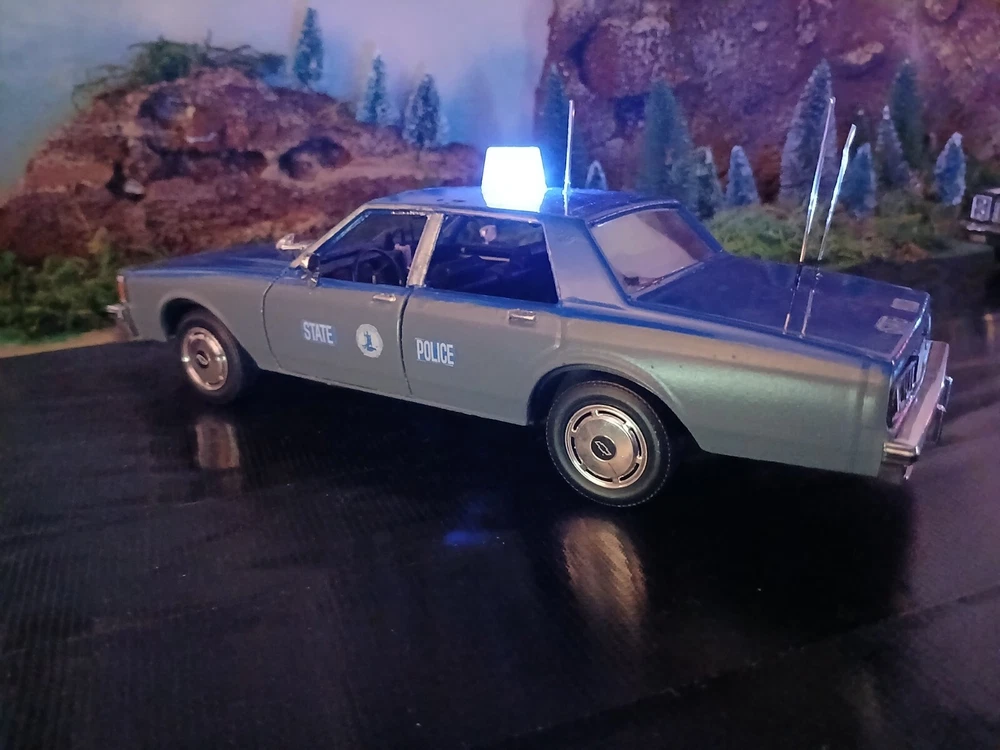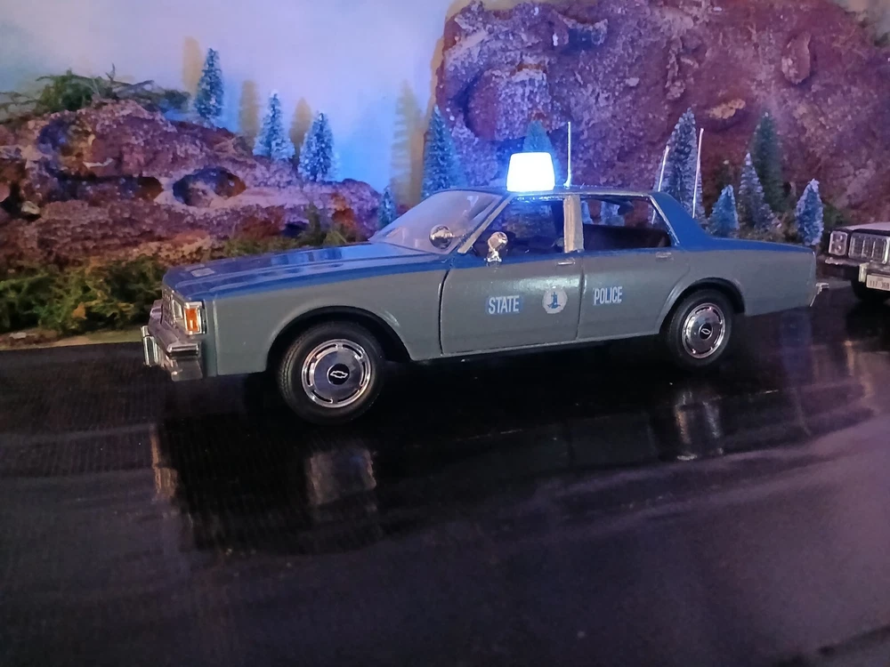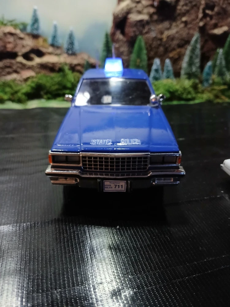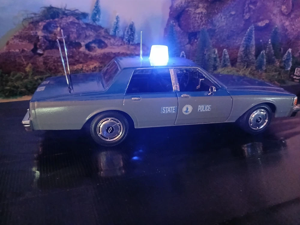 1/24 custom Virginia State Police Chev. Caprice with Bubble light on top flashing blue. Video available. Not sure how to attach it but if you would like to see it let me know thanks. Three antennas on top. If they break off during shipping or if you happen to knock them ott they just slide back down. Each one has its own independent hole. I was going to put a radar on the side but its just something else to break off. The mirrors and spotlight are delicate. I will carefully bubble wrap it up. Car rolls just fine. Under neath is a 9 volt battery tucked up in the trunk that way its outta sight.... The light flashes for a good long while. I would estimate about a week on a good alkaline battery. I use just general heavy duty batteries from roses dept store. they are 2 for a dollar and I believe they are just as good for projects like these. I will include a couple batteries for you to enjoy the car.... The car came with a long lightbar but a Federal signal was used by the VSP so I found what I could and used that. You can see the marks from the original lightbar. Comes with license plates. If you have a specific number you would like for me to use let me know before I ship out. I can put a short name or number. I dont mind. I like helping folks and this is my hobby and enjoy it very much. Anyway this ships out same day or next day payment is received. Please ask questions and look at the photos. NO RETURNS as I am pushing these out to make room for the next round thats coming in from Greenlight and motor max. Thanks!! Happy New Year!!!!