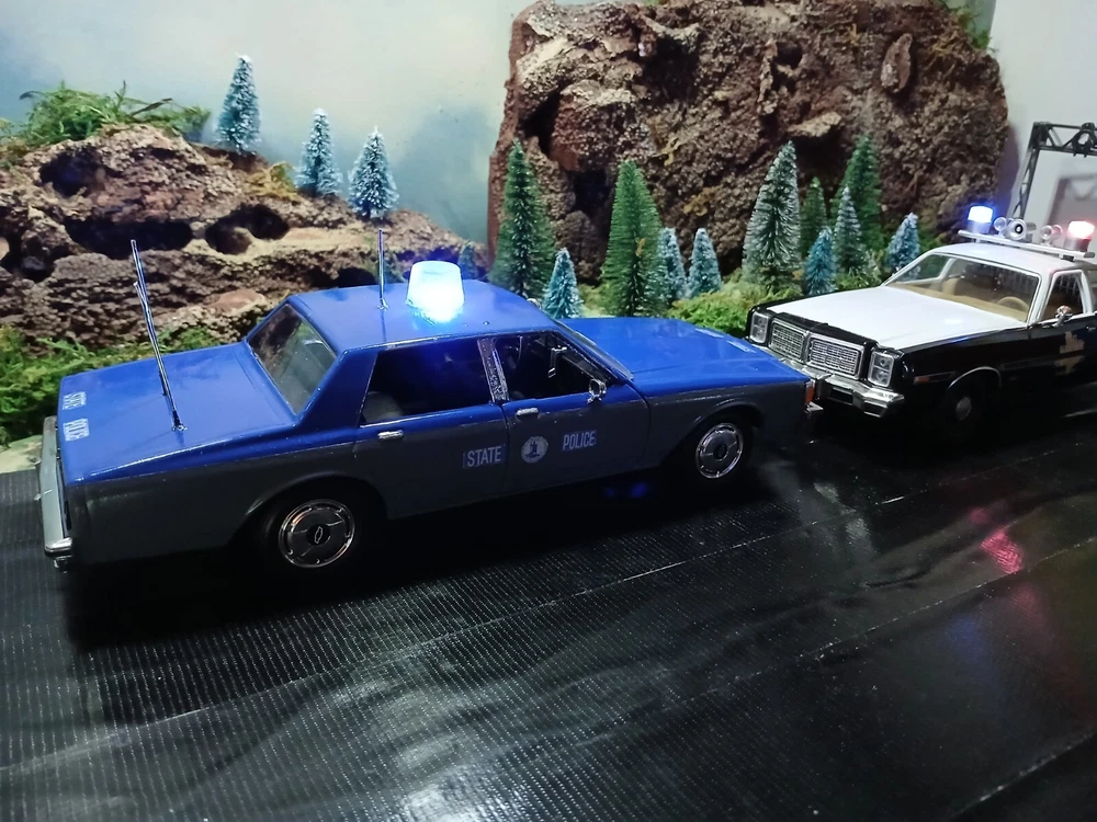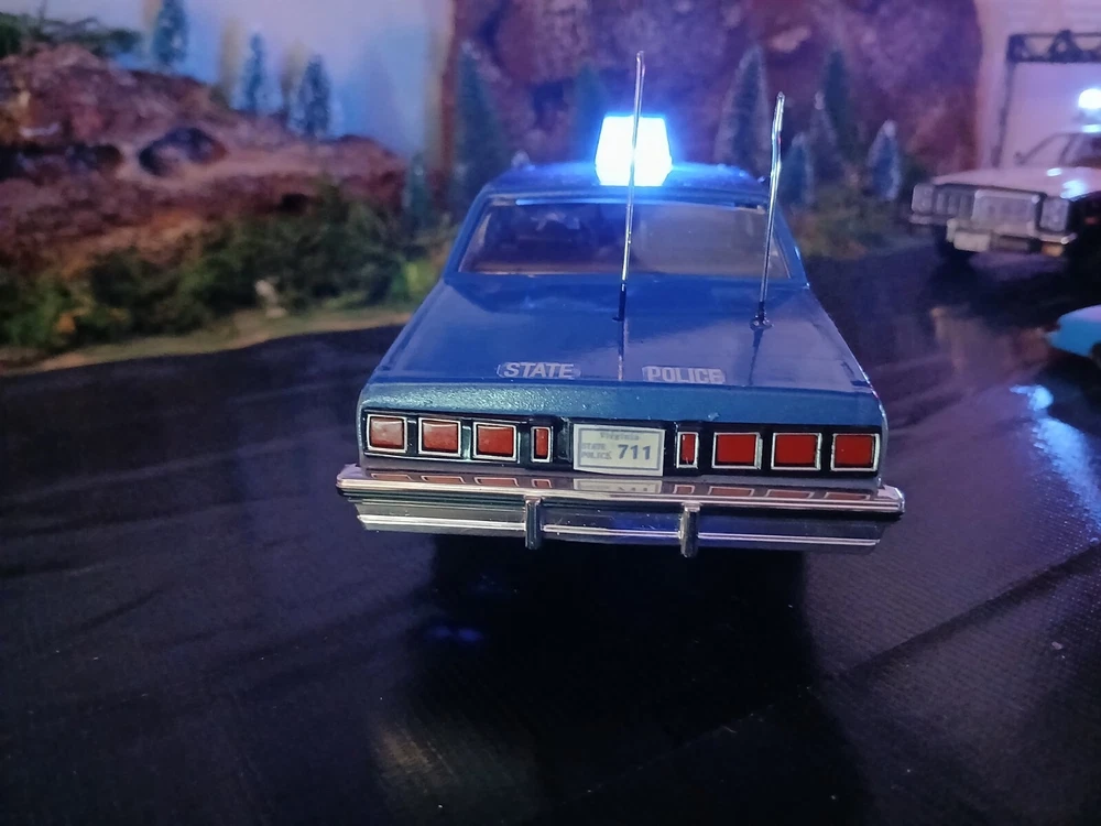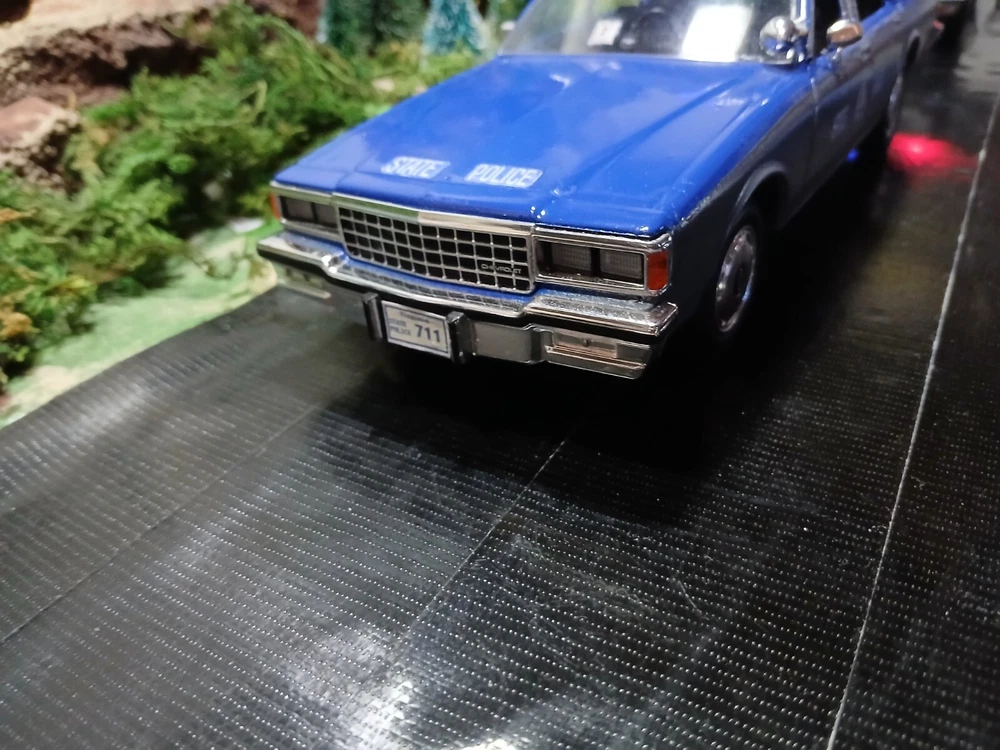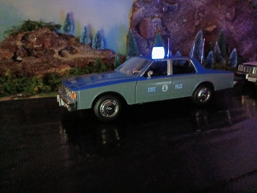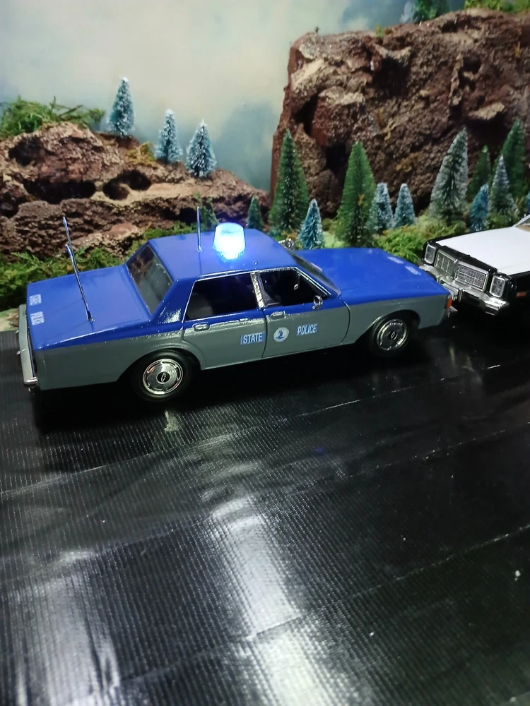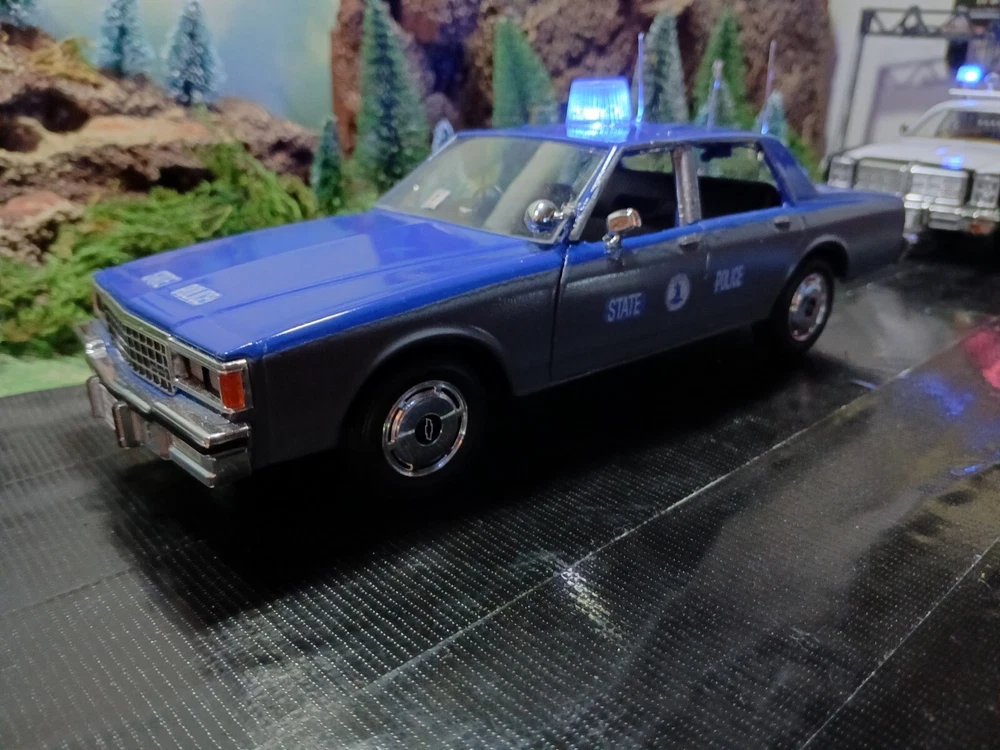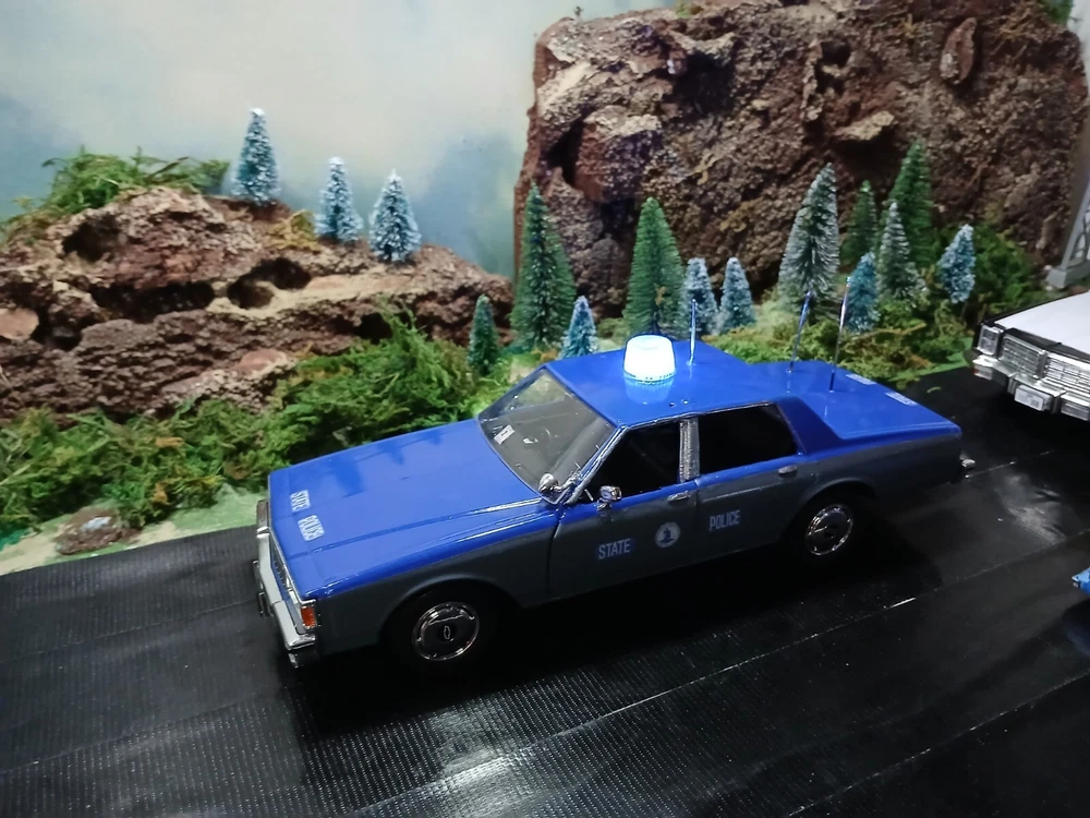 1/24 custom Virginia State Police Chev. Caprice with Bubble light on top flashing blue. Video available. Not sure how to attach it but if you would like to see it let me know thanks. Three antennas on top. If they break off during shipping or if you happen to knock them ott they just slide back down. Each one has its own independent hole. I was going to put a radar on the side but its just something else to break off. The mirrors and spotlight are delicate. I will carefully bubble wrap it up. Car rolls just fine. Under neath is a 9 volt battery tucked up in the trunk that way its outta sight.... The light flashes for a good long while. I would estimate about a week on a good alkaline battery. I use just general heavy duty batteries from roses dept store. they are 2 for a dollar and I believe they are just as good for projects like these. I will include a couple batteries for you to enjoy the car.... The car came with a long lightbar but a Federal signal was used by the VSP so I found what I could and used that. You can see the marks from the original lightbar. Comes with license plates. If you have a specific number you would like for me to use let me know before I ship out. I can put a short name or number. I dont mind. I like helping folks and this is my hobby and enjoy it very much. Anyway this ships out same day or next day payment is received. Please ask questions and look at the photos. NO RETURNS as I am pushing these out to make room for the next round thats coming in from Greenlight and motor max. Thanks!! Happy New Year!!!!