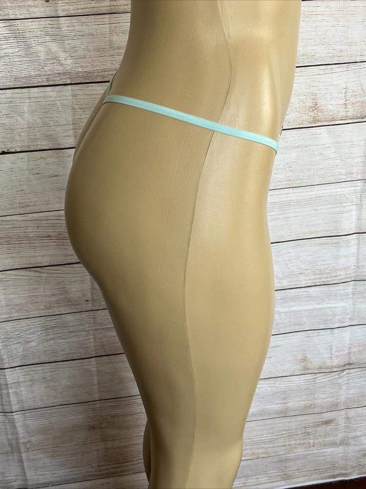 This Vision Intimates women's teal lace thong in size S features a floral pattern and is made of lightweight nylon material. It is designed as a thong/string style panty with lace fabric, emphasizing the waist area. The item is brand new with tags (NWT) and is ideal for women seeking a vision of elegance and comfort in their intimate wear.