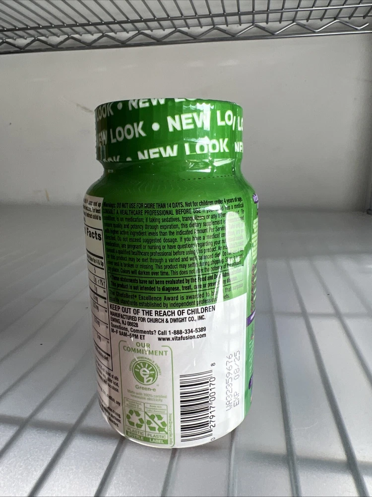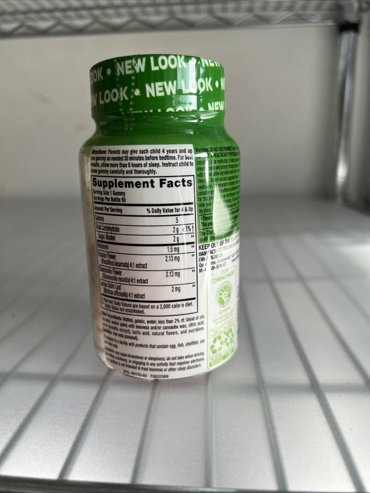 Flavor:PeachDepartment:Does not applyMain Purpose:Sleep SupportCountry/Region of Manufacture:Does not applyType of Diet:Does not applyVolume:Does not applygtin13:0027917001708Active Ingredients:Passionflower (Passiflora)Item model number:10027917001705Features:Dairy-Free, Gluten-Free, Sugar-Free, Animal Cruelty-Free, No High Fructose Corn Syrup, All NaturalNumber of Pills:50Item Weight:Does not applyProduct Dimensions:2.38 x 2.38 x 4.5 inches; 5.36 ouncesWhen to Take:NightDosage:1.5 mgMPN:7C11Type:Dietary SupplementBrand:vitafusionExpiration Date:Does not applyFormulation:Gummy, ChewableIngredients:Water, Coconut Oil, Gelatin, Passionflower (Passiflora), ChamomileUPC:0027917001708Manufacturer:Church & Dwight - Nutrition & Wellness