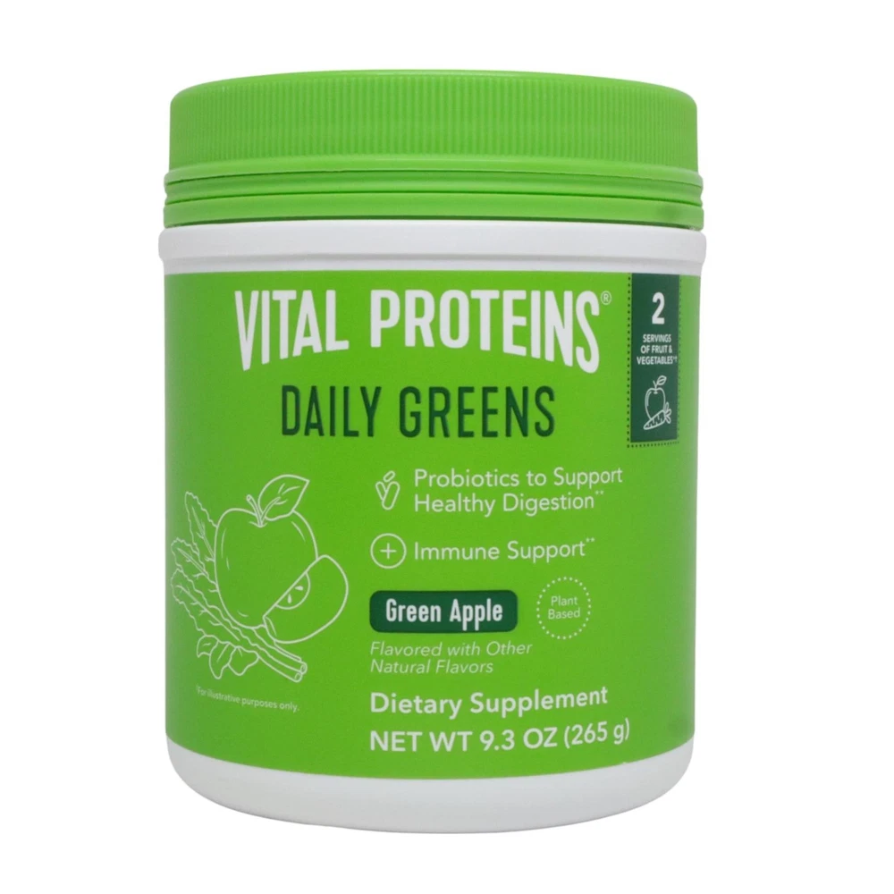 Vital Proteins Daily Greens to Support Healthy Digestion - Green Apple - 9.3 oz Vital Proteins Daily Greens is a delicious, plant-based supplement that can easily be incorporated into your daily wellness routine. Available in Original (unflavored) and Green Apple, this light and refreshing greens supplement is loaded with support for your immune system and digestive health—a true plant-based multitasker. Features Getting your greens just got tastier with a light and refreshing apple flavor derived from real apples This powerful, nutrient-rich blend contains 2 servings of fruits and vegetables^ and zero wheatgrass Probiotics and plant fiber supports digestive health and a healthy immune system** by increasing daily intake of vitamins, minerals and antioxidants** These collagen-free Vital Proteins Daily Greens provide a boost of vitamin C which supports collagen intake making this the perfect supplement to pair with collagen peptides Start your day off on the right foot by combining 1.5 TBSP with 8-10 fl oz of cold water, and stir, froth or shake until completely dissolved Details Product Dimensions: 4.8 x 3.74 x 3.7 inches Item Weight: 0.71 pounds Shipping Weight: 0.71 pounds Manufacturer: Vital Proteins Item model number: 0810089954824 Item MPN: 0810089954824 Item part number: 0810089954824 Fast & Free Shipping Orders are shipped out within 2-3 business days usually and delivered to your doorstep as quickly as possible. Competitive Pricing Our competitive prices are some of the lowest that you will find on the internet. Rest assured that you're getting a good deal when purchasing from us. 30-day Money Back Guarantee We are committed to making sure that you leave this transaction satisfied. If you're unhappy with the product for any reason, you may return it back for your money-back or a replacement if available within 30 days.