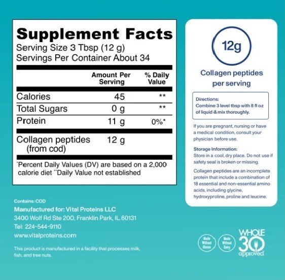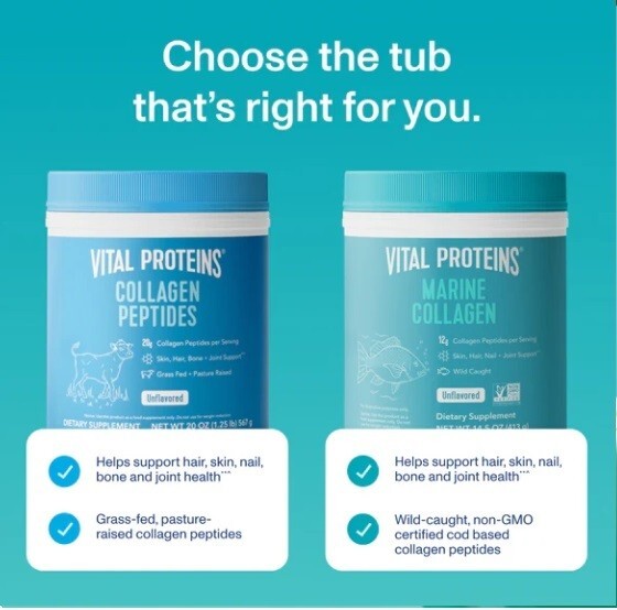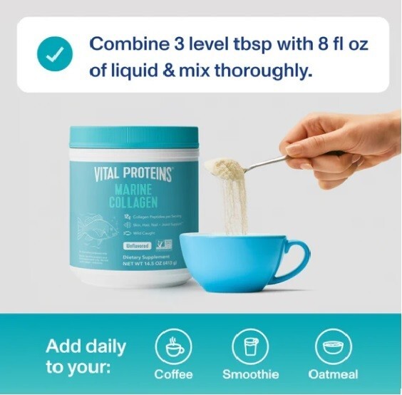 Features: About 34 Servings 12g Collagen Peptides (from Cod) 11g Protein, 0g Sugar Pescatarian Friendly Made Without Gluten & Dairy Product Information - Vital Proteins® Marine Collagen contains 12g of collagen peptides per serving and is made from the scales of non-GMO Certified, wild-caught cod. It's highly bioavailable and digestible. Benefits - Wellness Boost: Helps support healthy hair, skin, nails, bones and joints**^ Bioavailable: Digested and absorbed by the body quickly for maximum benefits**^ Easy To Use: Just add to your favorite beverage or recipe, stir & enjoy. Ingredients - collagen peptides (from cod) How to Use - Our marine collagen peptides easily dissolves in hot or cold liquids, and 1 serving a day is all you need! Adding a serving of this marine collagen powder to different foods (like desserts or dressings ) or beverages (like smoothies or water) gives you the boost you need to support healthy hair, skin, nails and joints.**^ For a complete list of recipes , visit our Lively blog . FAQs - What's The Difference Between Collagen And Marine Collagen? It all comes down to sourcing. Our Collagen Peptides is sourced from the hides of grass-fed, pasture-raised bovine, while our Marine Collagen is sourced from non-GMO, wild-caught cod. The latter is a favorite among those following a pescatarian-friendly diet. Marine collagen's benefits are the same as the benefits of bovine collagen . What Types Of Collagen Are In Our Marine Collagen Powder? Our pescatarian-friendly marine collagen powder is Types I and III . Type I is the most prevalent type of collagen in the body. This is the type of collagen you're probably thinking about if you're interested in preserving the levels of collagen in your skin, hair or nails. But Type I collagen isn't just a beauty-related substance. It's also a major component of the tendons, organs and bones. Type III is generally found in reticular fibers, such as in the bone marrow. It's usually found alongside Type I collagen in the body. Can You Use Collagen For Weight Loss? Marine Collagen, like any protein, may promote satiety (a feeling of fullness) and can easily be added to any beverage, like fruit smoothies or post-workout shakes. We advise using this product as a food supplement only. Do not use collagen for weight loss . Since we can't offer individual medical advice, we recommend discussing your health goals with your licensed healthcare professional. How Much Collagen Should You Take Every Day? While we typically recommend taking 10-20g of collagen per day, we also recognize everyone's lifestyle and wellness goals are different.