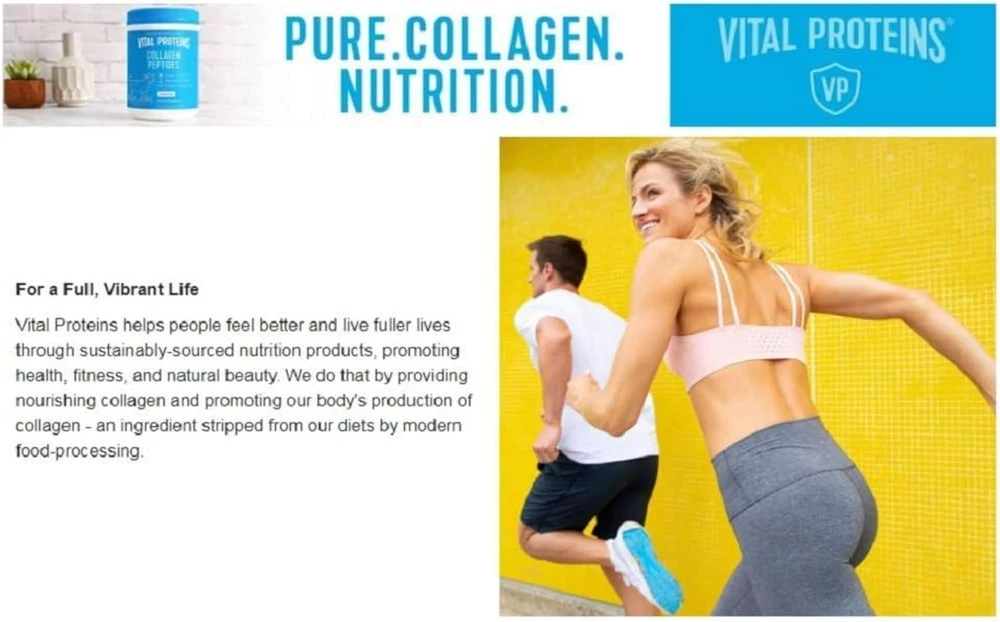 Vital Proteins Natural Whole Nutrition Collagen 34 Servings (Pack of 1) Product Details Product Dimensions : 5 x 5 x 7 inches; 1.5 Pounds Item model number : 00866 Manufacturer : Vital Proteins Brand: Vital Proteins Flavor: Unflavored Primary Supplement Type: Vitamin C Unit Count: 24.0 Ounce Item Form: Powder Item Weight: 1.5 Pounds Item dimensions L x W x H: 5 x 5 x 7 inches Special Ingredients: Collagen Diet Type: Paleo, Gluten Free, Kosher Product Benefits: Nourishing Bioavailable: Digested and absorbed by the body quickly for maximum benefits Beneficial: Helps improve hair, skin, nails, joints and ligaments, and tendon health asy to Use: Soluble in hot or cold liquids, including coffee, smoothies, and baked goods Many Uses: Stir into water, fruit juice, or other beverages, Add to smoothies as protein booster or mix with oatmeal, soups, or sauces Dairy Free , Gluten Free, Low Carb, Kosher Collagen Peptides are neutral in flavor and are great for adding to water, coffee, smoothies, recipes, and more. Our Collagen Peptides are easily digestible, mix in hot or cold liquids, and can be taken any time of day. 20g Collagen per serving. Paleo + Keto Friendly. Grass fed + pasture Raised.