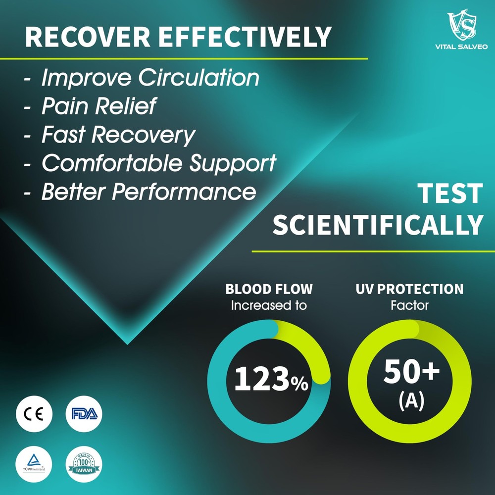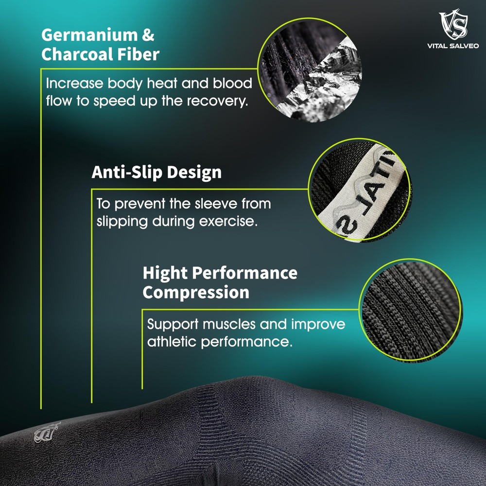 "Vital Salveo - Germanium & Carbon Recovery Compression Outdoor Full-Length Leg Knee Sleeves - Embroidered Logo (1 Pair) with superior compression to provide the maximum boost to your circulation. Made with a blend of Germanium and Carbon fibers, it enhances breathability, moisture-wicking, and odor control for all-day comfort. The full-length design covers your knee and thigh with a perfect fit and compression. CAUTION – If you have sensitive skin, we recommend taking it off when you finish sports. Do not wear it for a long time. Please make sure you pull the leg sleeve to the top of your leg so it can stay in place and prevent slipping. INNOVATIVE FIBER TECHNOLOGY -- Our fabrics have elasticity, and the compression will support and heighten awareness of your core muscles, helping you recover faster. Made with a blend of Germanium and Carbon fibers, this full-leg sleeve enhances circulation, reduces fatigue, and provides optimal muscle and joint support. PROFESSIONAL COMPRESSION TECHNOLOGY -- Provide medium graduated compression to reduce soreness and ease the leg discomfort. It also supports your muscle and increases your athletic activities. COMFORTABLE AND BREATHABLE FOR DAILY WEAR -- Seamlessly knit with breathable Carbon fiber, this sleeve provides an exact fit while wicking away moisture, controlling odor, and keeping your leg fresh throughout the day. It also offers UPF 50+ sun protection, making it perfect for all-day wear, whether you're playing basketball, hiking, jogging, walking, running, or more! HELP YOU GET THROUGH THE TOUGH TIME -- It also helps a lot if you are suffering from arthritis, tendonitis, inflammation, injury or muscle soreness, joints pain, and muscle stiffness. We cannot cure them but it can ease your pain. UPGRADED ANTI-SLIP DESIGN -- Silicone gel on the top edge of the sleeve for anti-slip during intense activities. Make sure you pull the leg sleeve to the top of your leg, so it can stay in place and prevent it slip. If you have sensitive skin, we recommending take it off when you finish sports and do not wear it for a long time.
