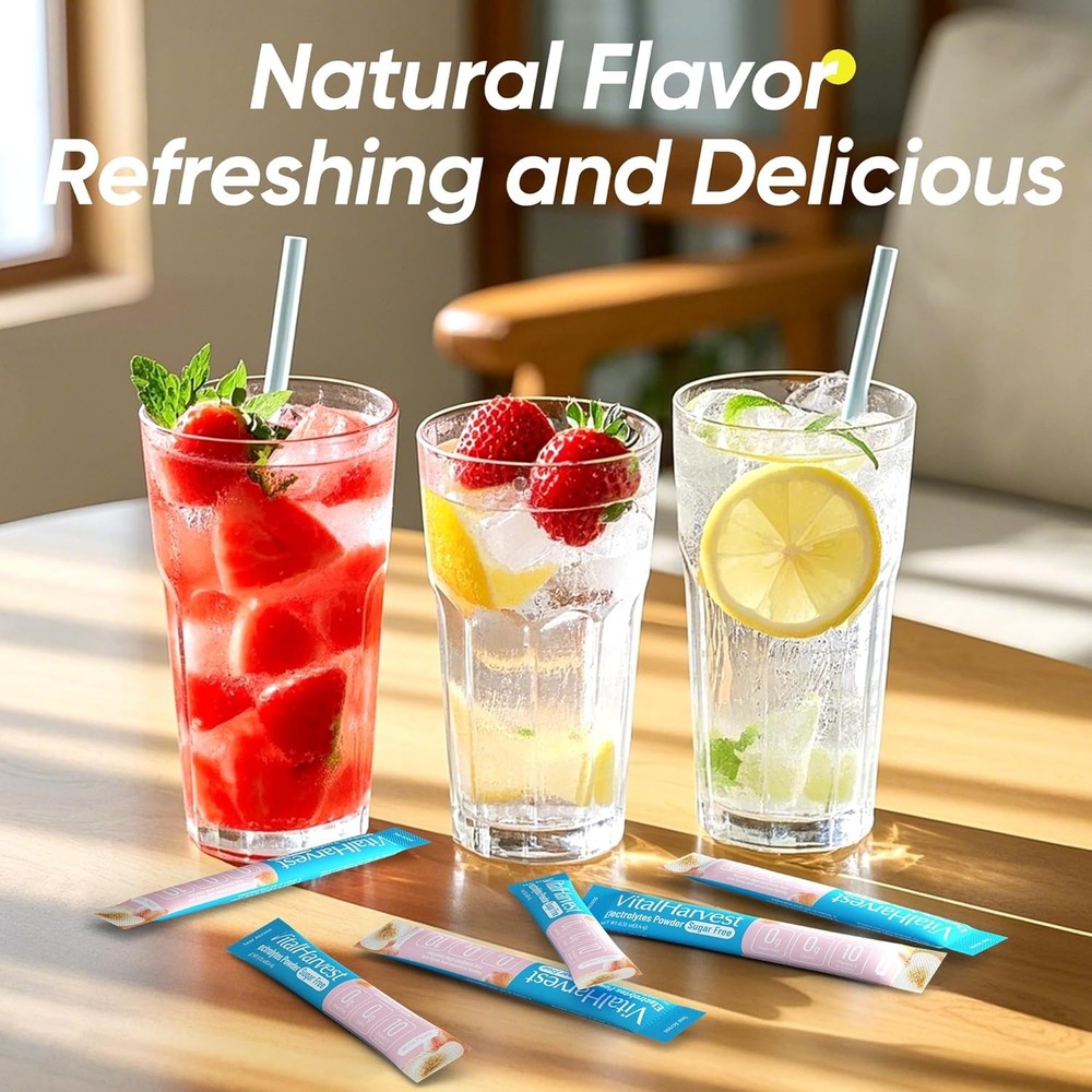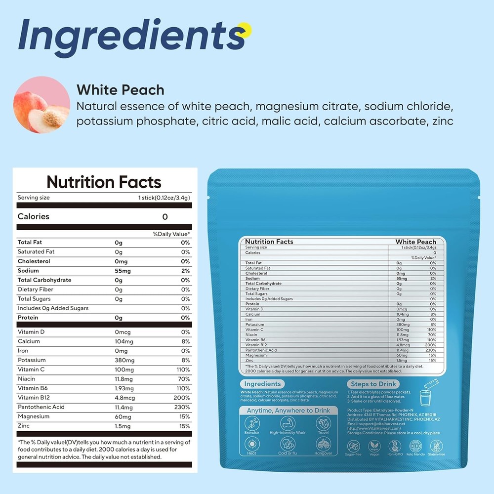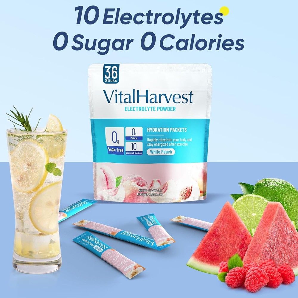 VitalHarvest 36 Sticks Electrolytes Powder Packets Sugar Free 36 Count Description Features: 【Rapid and Effective Hydration】 Each sugar-free electrolytes powder packets contains 5 minerals (sodium, potassium, calcium, magnesium, and zinc) and 5 nutrients (vitamin C, vitamin B6, vitamin B12, niacin, and pantothenic acid). It replenishes water and electrolytes lost in the body faster than plain water, maintaining osmolar pressure of intracellular and extracellular liquids, relieving fatigue, and quickly restoring physical energy. 【Sugar-Free and Deliciously Refreshing】Unlike other market alternatives, our formula doesn’t overpower with saltiness or sweetness. These hydration powder with sodium content within the nutrition recommendation range are ideal for those on low-carb or keto diets, intermittent fasting, or vegetarian lifestyles. 【Revitalize and Replenish】The electrolytes powder packets no sugar can prevent dehydration, extreme thirst, dry skin, muscle spasms, headaches, fatigue, and confusion caused by high-intensity exercise, travel,l or busy work, which can quickly rehydrate, balance body fluids, speed up recovery and keep you energized. 【Portable Single-Serving Packets】Our compact individual packaging is easy to carry, ensuring you can stay hydrated anytime, anywhere. Ideal for travel, sports activities, parties, and daily use, it’s a must-have for people working in high-temperature environments such as firefighters, construction workers, solar farms, or oil fields. 【Easy to Use】Simply mix 1 package with 16 ounces of water to enjoy your preferred taste. Shake or stir until dissolved and drink. The taste is better on ice. (If you find the flavor light, you can appropriately reduce the amount of water.) Kind reminder: Please add water first, then pour in the electrolyte drink mix package and shake or stir to dissolve it faster! Product Details: Package Dimensions : 7.24 x 6.93 x 2.8 inches; 2.82 ounces Manufacturer : VitalHarvest Country of Origin : China Brand: VitalHarvest Flavor: White Peach Primary Supplement Type: Calcium, Vitamin C, Magnesium, Potassium, Zinc Unit Count: 4.3 Ounce Item Form: Bar Item Weight: 80 Grams Product Benefits: Supports Electrolyte Balance Number of Items: 1 Material Feature: Low Sodium Material Type Free: Sugar Free Handling We will ship all orders within 1 business day of payment. Delivery We Do Not Ship Outside of the Continental US. Return Policy All items qualify for returns within 30 days of receipt. Buyer is responsible for return shipping on any item that is not damaged. Feedback We take our reputation seriously, we buy and sell online, so we understand the value of trust. If you are unsatisfied with your order, please contact us and we will work with you to resolve it to your satisfaction.