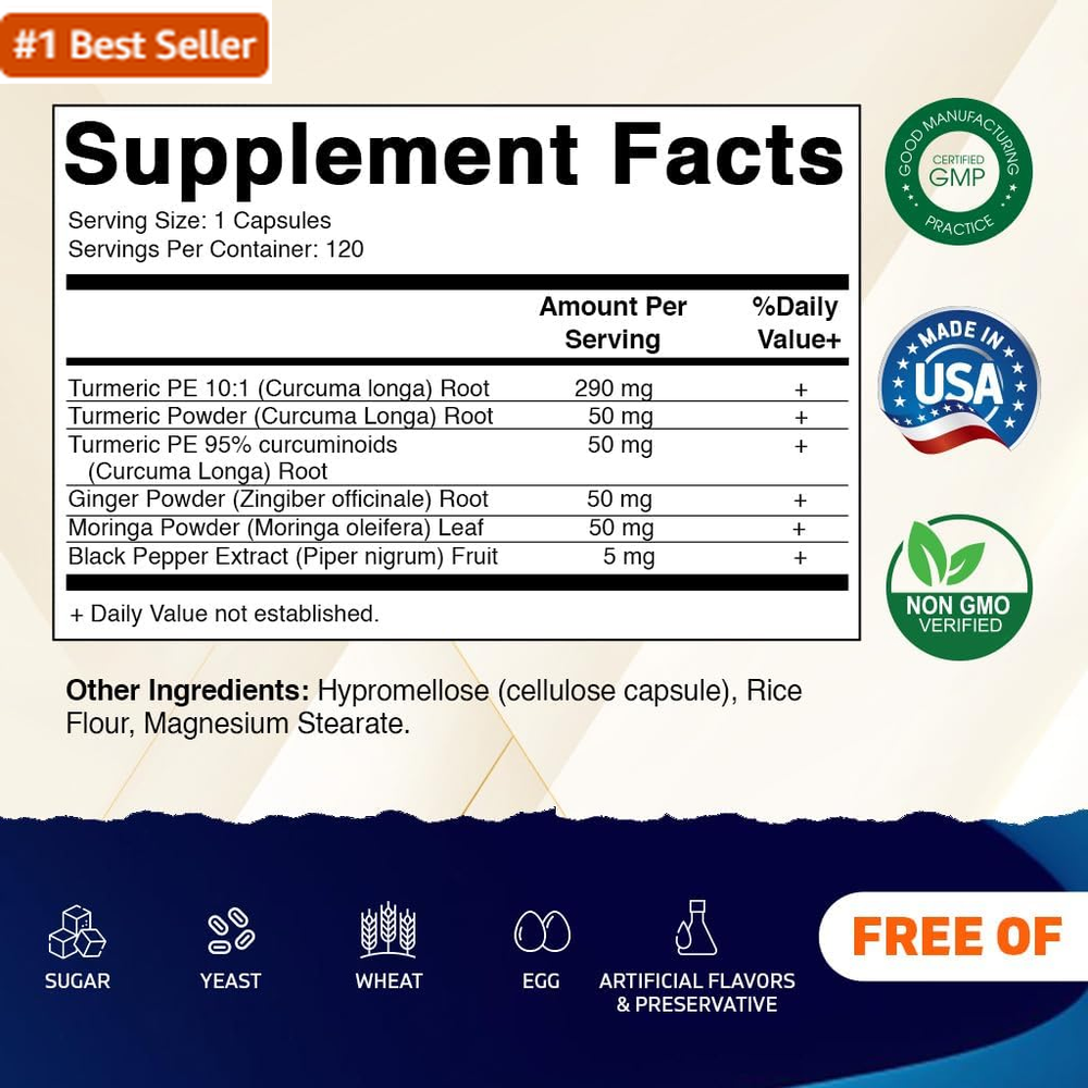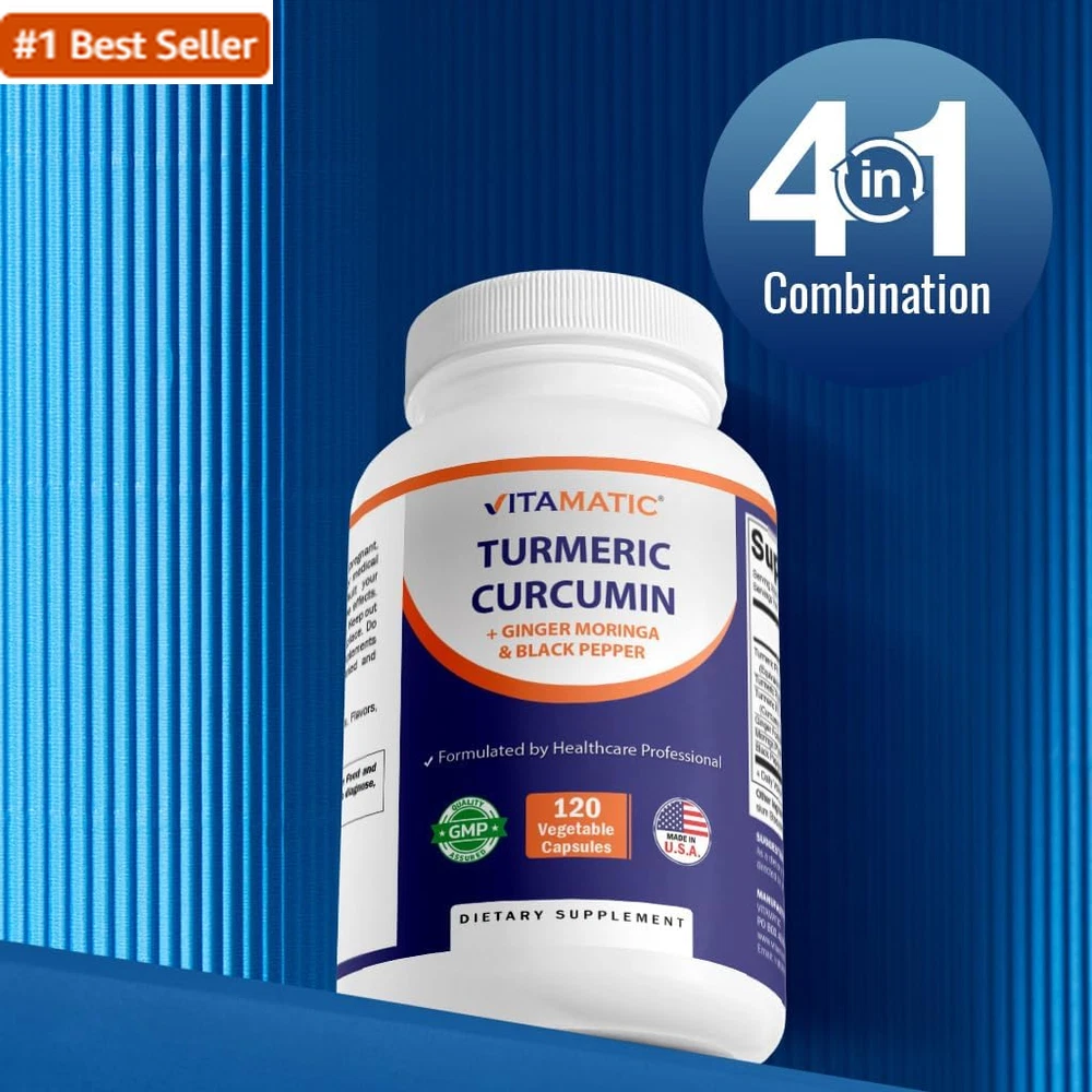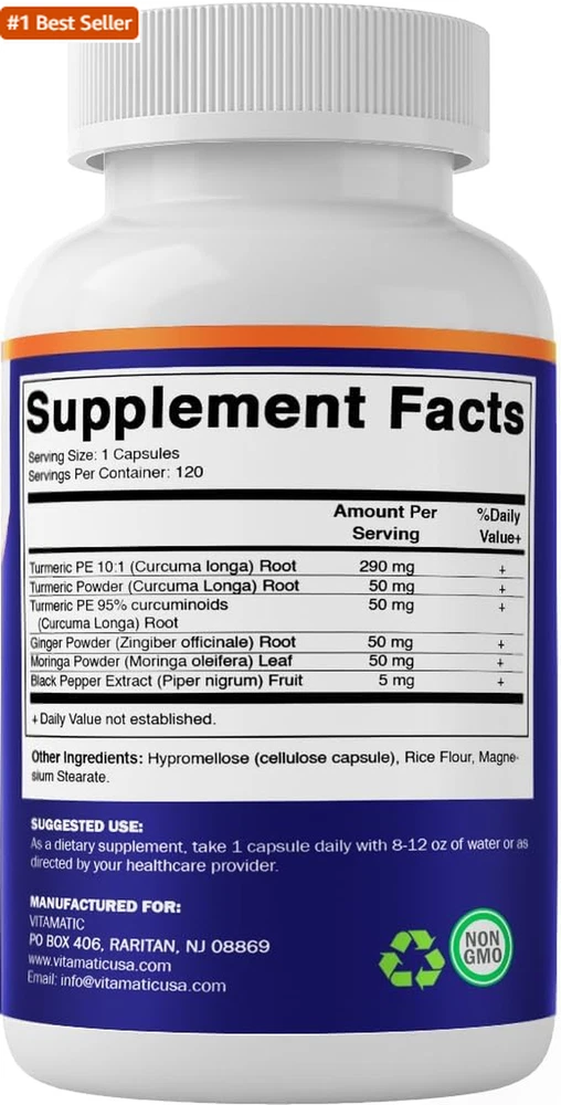 Vitamatic Turmeric Curcumin Supplement (10:1 Equivalent 3000 Mg per Serving, Made with 95% Curcuminoids, Black Pepper, Ginger, Moringa) 120 Vegetable Capsules, Non-Gmo, Gluten Free (120 Capsules) MADE WITH 95% CURCUMINOIDS, GINGER, & MORINGA - Our premium Turmeric Curcumin Complex; with 95% Standardized Curcuminoids, Ginger, Moringa and enhanced with Black Pepper to provide maximum absorption and bio-availability ENHANCED ABSORPTION WITH BLACK PEPPER: Black Pepper, with ginger, has been shown to improve the absorption of many herbs and spices; and provides as much as 2000x better absorption than consuming normal turmeric capsules alone Third-Party Tested: This product undergoes rigorous third-party testing to ensure quality and purity. Vegetarian Capsules: Made with vegetable cellulose, these capsules are non-GMO and gluten-free. Convenient Dosage: With 120 Capsules / 120 Servings per bottle, this supplement provides a long-lasting supply. Easy to Swallow: The capsules are designed for easy consumption and absorption. QUALITY ASSURED: Made in the USA in an FDA-inspected facility following strict GMP guidelines. Product Description 1 Subscribe & Save 2 Formulated by Experts 3 Made in USA Item Package Quantity 1 Product Dimensions 2 x 2 x 3.9 inches; 3.53 ounces Package Information Vegetable Capsules Item Form Capsules Brand Vitamatic Manufacturer Vitamatic Shipping Fast shipping is very important for us. Our standard US shipping service is FREE. Your order will be shipped within 2-3 business days upon full payment received. Your order will be delivered within 2-3 business days after the handling time. We only ship to the confirmed PayPal address. We reserve the right to cancel any order for any reason at any time. We are not responsible for undeliverable addresses. Returns and payment We offer a 30 days return policy from checkout winning date. We allow only PayPal as payment method FeedBack Your feedback very important to us, after you get your package and you are satisfied with our service please leave us positive feedback If you have any problem with your order / any questions please before leave any type of feedback For any questions, using eBay contact system Please visit our eBay store to check out other items for sale! Thank you for shopping at our store.