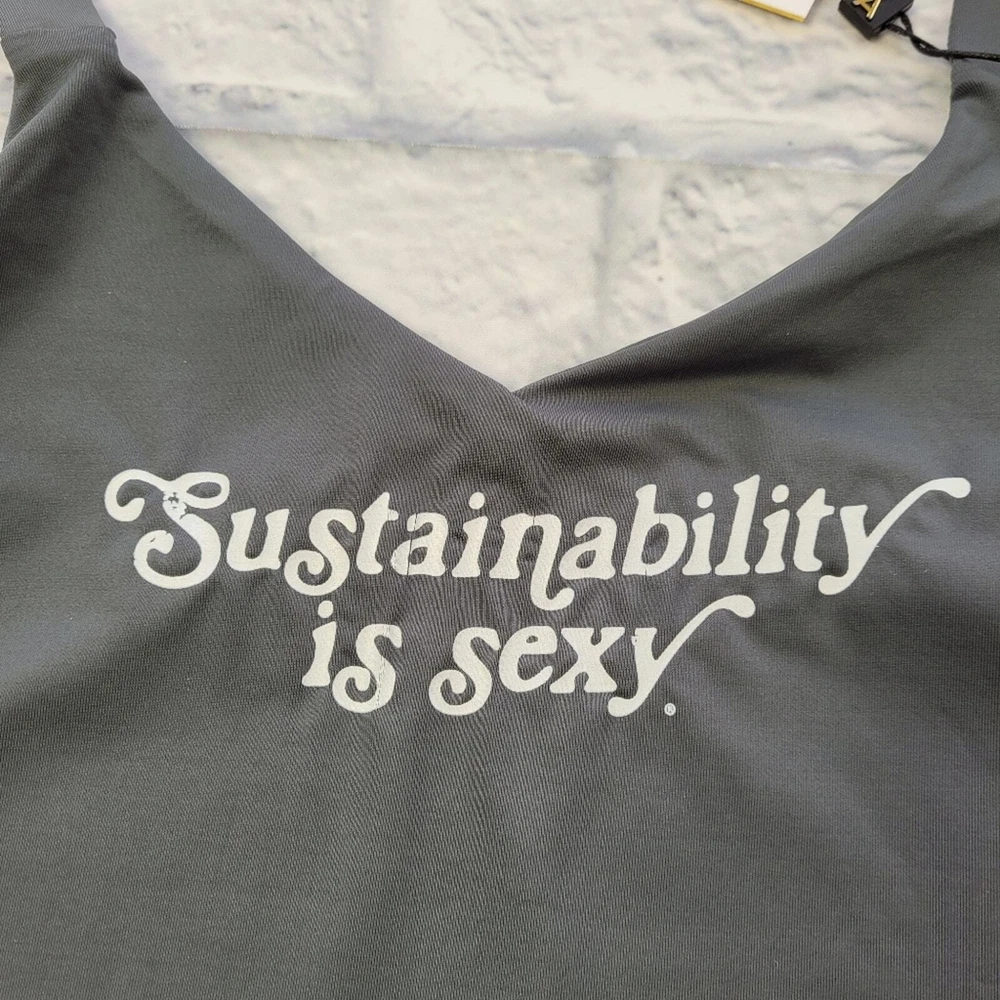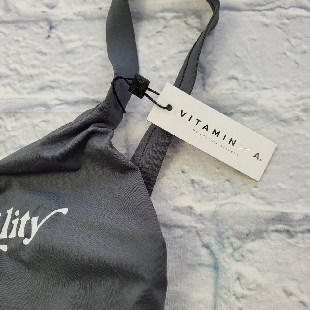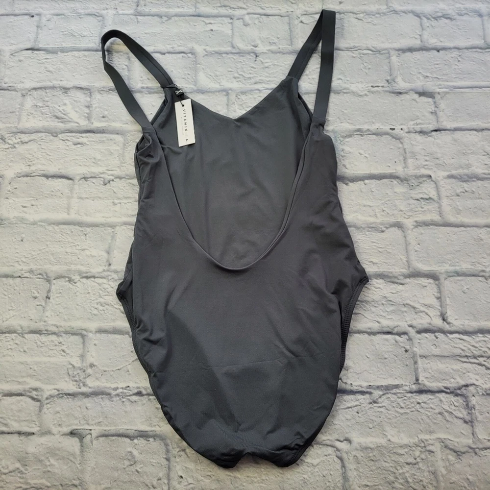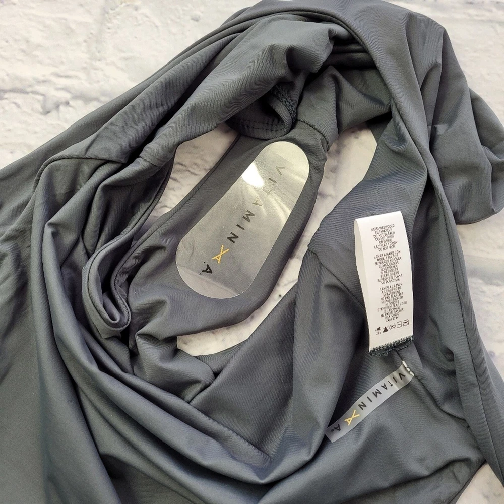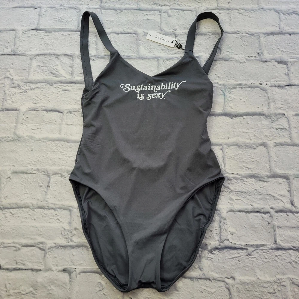 Limited edition Sustainability is Sexy is the motto of Vitamin A. They believe that style and substance can coexist. Size medium (8) please see size chart photo Grey Open back Full coverage 83% recycled nylon 17% lycra spandex Hand wash Made in USA The Laguna beach–based brand boasts a lengthy list of sustainability efforts. The brand’s founder Amahlia Stevens patented its EcoLux fabric (a signature, sustainable weave made of superfine matte jersey). Its strictly monitored factories are based in California with a dedication to fair trade. New with tags *No returns on swimwear for sanitary concerns* 0067