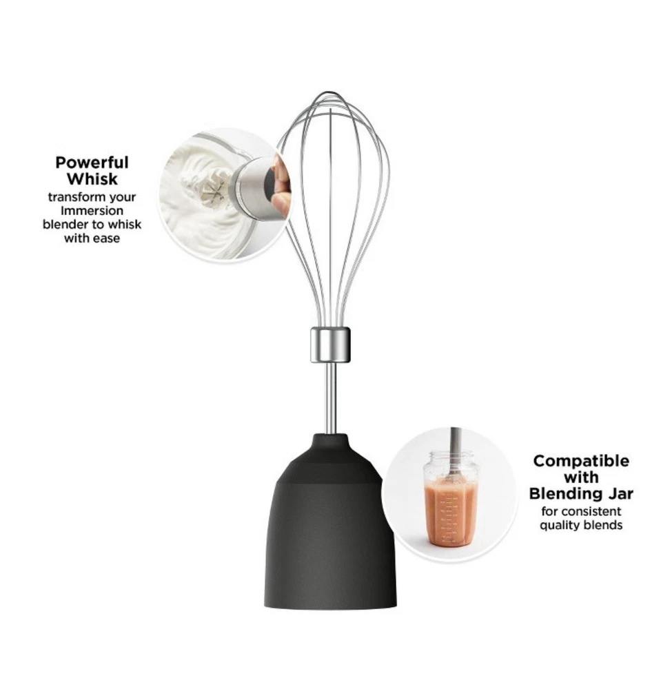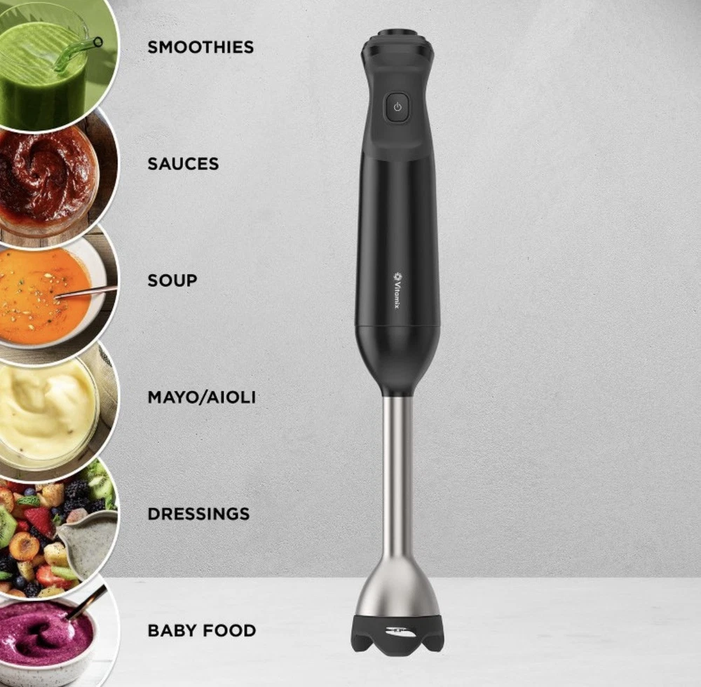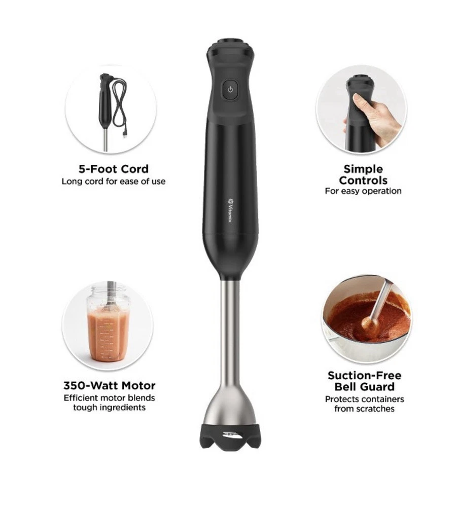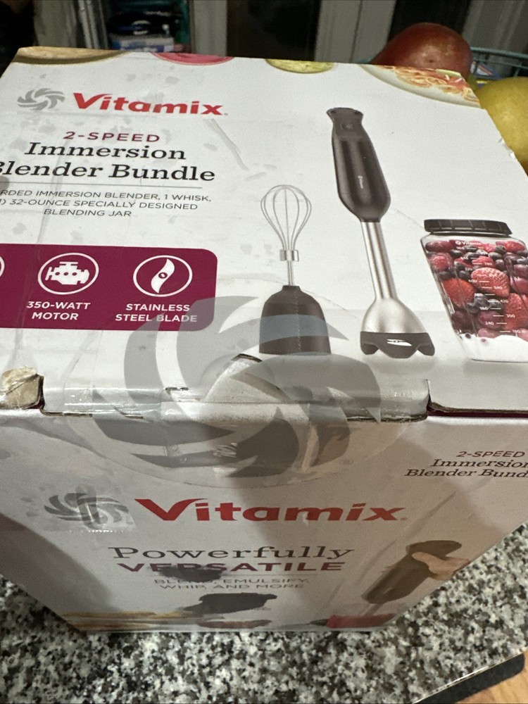 Vitamix 2-Speed Hand Immersion Blender Bundle with Whisk and Jar Black: Stainless Steel, 350W, Hand Held, Food Processor This is a New product. It sealed on top but i had to open on bottom just to make sure everything was right and complete. Durable Motor: The 350-watt motor blends everything from single-serving smoothies to sauces and soups. • Precise Textures: Two speeds and a two-pronged blade help you create ideal textures for every blend. • Unique Bell Guard: Our specially designed bell guard reduces suction and helps ingredients flow easily through the blades while protecting pots, pans, and your favorite blending containers from scratches. • Blend in Any Container: With our Immersion Blender, you can blend in any container with a 3-inch wide (or larger) opening, including a smoothie cup or a 1-quart wide-mouth Mason jar. • Cord for Convenience: The 2-Speed Immersion Blender has a five-foot cord for ease of use, so you can blend with dependable power. • Whisk Attachment: Quickly whip up aquafaba, batters, meringues, eggs, cream, and more. • 32-Ounce Blending Jar: Blend right in the cup, then take it on the go. The sides of the cup are designed just like a Vitamix blender container, so you'll get a Vitamix-quality blend every time. This easy-to-assemble hand-held blender offers Vitamix performance, two-speed control, a protective bell guard to prevent scratches, a blending jar, and whisk attachment – all at an affordable price. It’s covered by a two-year full warranty, so you’ll be creating healthy, delicious dishes for years to come.