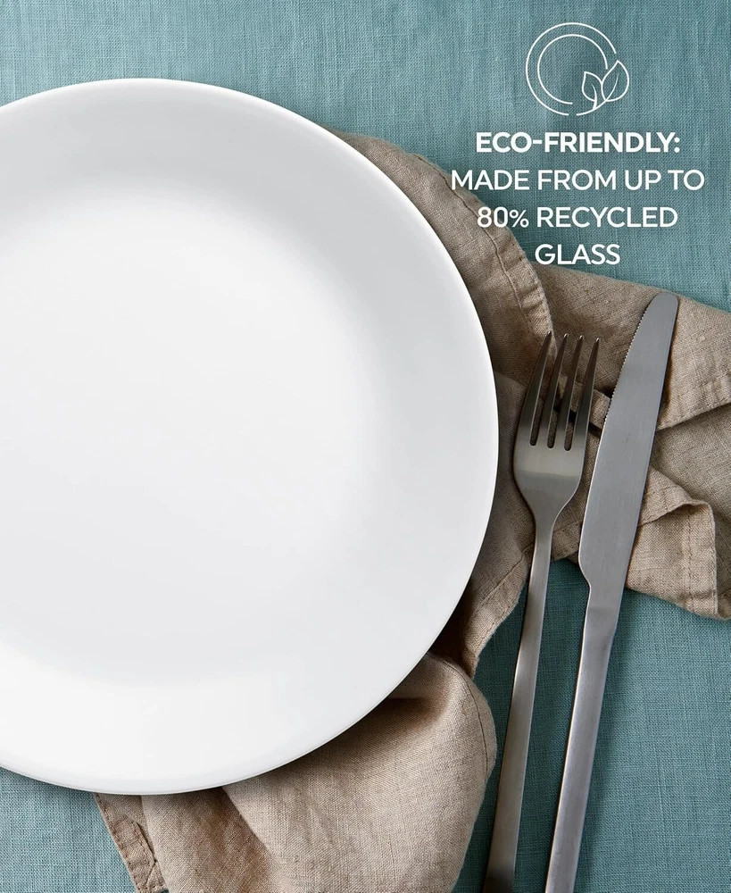 Vitrelle 18-Piece Service for 6 Dinnerware Set, Triple Layer Glass and Chip Resistant, Lightweight Round Plates and Bowls Set, Winter Frost White 18-PIECE SET: Includes (6) 10-1/4-inch dinner plates, (6) 6-3/4-inch appetizer plates and (6) 18-oz soup/cereal bowls. This set has everything you need for a full table service of 6, and it comes with the classic style. LIGHT AND STRONG: Say goodbye to chips and cracks with 's triple-layer-strong glass plates and bowls. This durable dinnerware set is lightweight, easy to handle, and allows for compact stacking, which takes half the space of ceramic dishes. Size Information: Bread and butter Plate: " W x " D, Dinner Plate: " W x " D, Bowl: " W x 3" D LOW MAINTENANCE: This dinnerware set is designed to provide the best dining experience while requiring low maintenance. It's ultra-hygienic, non-porous and easy to clean. Plates and bowls are dishwasher safe and microwave safe. CLASSIC STYLE: If it's not broke, why fix it? 's minimalist approach by way of its crisp, bright and classic design brings a timeless aesthetic to this dinnerware set that blends with most kitchen environments. satisfaction: This item has a 3- satisfaction. TIMELESS BEAUTY: Crafted with pride in Corning, New York, Dinnerware are a staple of modern eating for everyday occasions, filling hearts and tables since 1970. DO NOT USE ON STOVETOP, under a broiler/griller, under a microwave browning element Functional and versatile, this living ware dinnerware set brings timeless and classic styling to your dining experience. Living ware winter Frost set includes 18 pieces total, including six (6) sets of each: 10-1/4-inch dinner plates, 6-3/4-inch bread and butter plates, and 18-ounce soup/cereal bowls. This set features simple and elegant all-white pieces, perfect for complementing your existing dinnerware. All pieces are made of triple-layer strong Glass, which is break and Chip Resistant, lightweight, and easily stackable for space saving. Dishwasher safe, this non-porous and versatile dinnerware can be used in the microwave and oven..