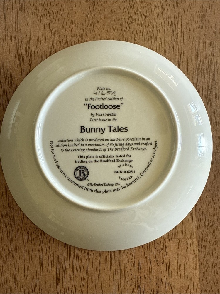 The Vivi Crandall Bunny Tales "Footloose" Collector Plate by Bradford Exchange features a charming woodland pattern with a round shape and multicolor design. Handmade of porcelain, this vintage collector plate from the late 20th century showcases a decorative style with a theme of wild animals. The art pottery production technique used by Bradford Exchange adds to the unique appeal of this collectible item, making it a delightful addition to any American culture-inspired collection.