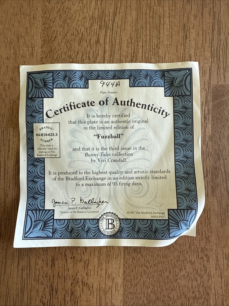 The Vivi Crandall Bunny Tales "Fuzzball" Collector Plate by Bradford Exchange is a vintage decorative piece featuring a charming woodland pattern with a bunny character. Made of porcelain with a multicolor design, this round 8-inch plate is handcrafted in the American style using art pottery techniques. Produced in the late 20th century, this collector's item is perfect for all occasions and adds a touch of whimsy to any collection or decor.