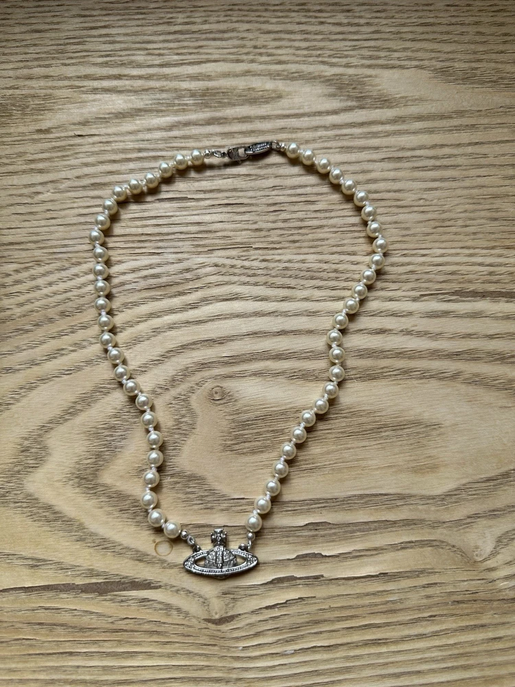 This Vivienne Westwood Silver Pearl Choker Necklace features an oval pendant with six round pearls, creating an elegant and stylish accessory. The necklace is crafted from silver with a ball/bead chain type, and has a length of 42cm. The design is perfect for adding a touch of luxury to any outfit, and is a timeless piece that can be worn for various occasions. Made in Japan, this necklace comes with a box, making it a perfect gift for someone who appreciates high-end fashion.