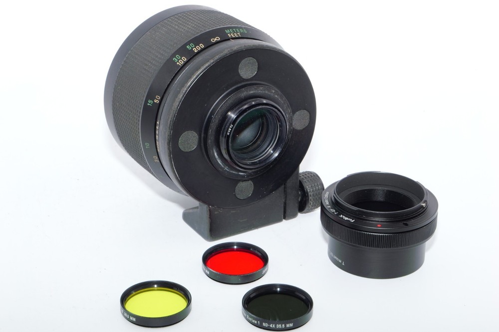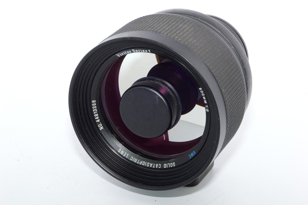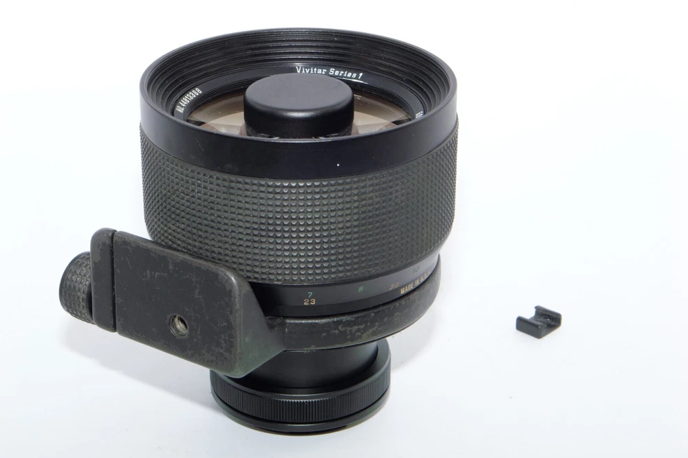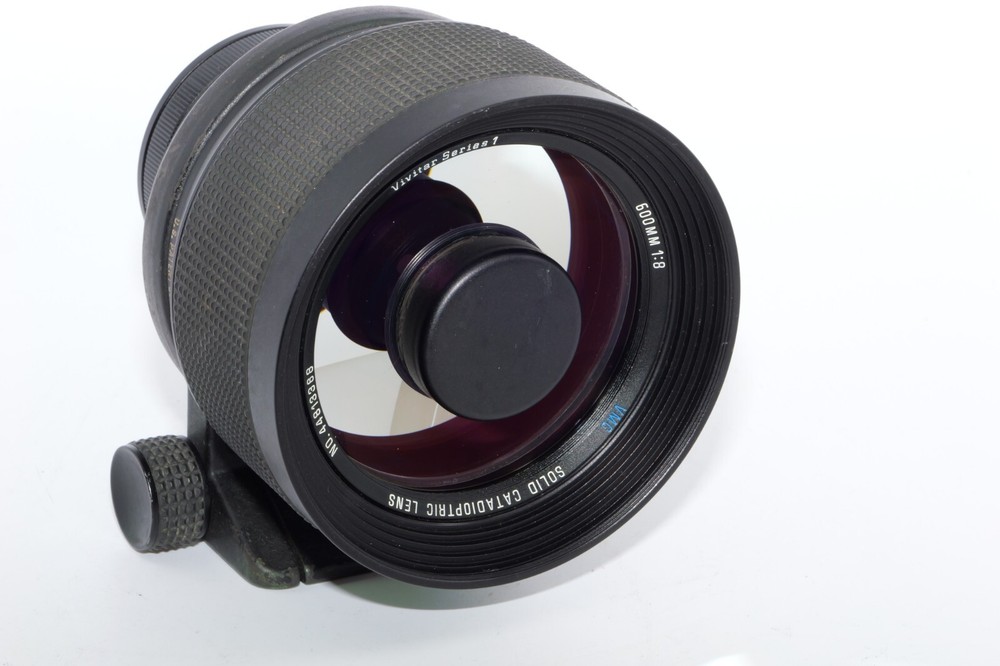 Vivitar Series 1 Solid Catadioptric 600 mm f/ 8 MIRROR manual focus lens. Made in USA. Serial # 44813368. This lens will fit Canon R mount mirorless cameras with the included Fotodiox Canon R t-mount adapter. Lens will fit many 35mm manual focus cameras. This lens has a universal t-mount, and will fit most camera brands with the proper t-mount adapter. Also a great lens to use on most mirrorless digital cameras with the proper adapter. This is a unique mirror telephoto lens that has fixed f/8 lens aperture. Quality solid cat optics, and heavy duty build. Focusing with this lens is quick and easy. Uses 35.5mm rear mounted filters. This 600mm solid cat lens is only 5 inches tall when focused at infinity. Minimum focus distance is about 9 meters. Lens is Ex- or 7.5 of 10 cosmetic condition. No dings or dents. Clean glass. Clean mirror without any separations. Smooth focus. This very compact heavy duty lens is seldom seen lens and makes for a fantastic long telephoto lens for 35mm film cameras, dslr cameras, or digital mirrorless cameras with the correct adapter. Lens comes with case (some foam on the inside of the case is deteriorated from age), lens hood, rear 35.5mm UV, red, ND4X, and yellow filters, & new Canon R t-mount adapter, caps. Sells with NO RESERVE at price of $395 . I have more SLR lenses, Medium and Large Format cameras, lenses and accessories on my other auctions and E-Bay Store.