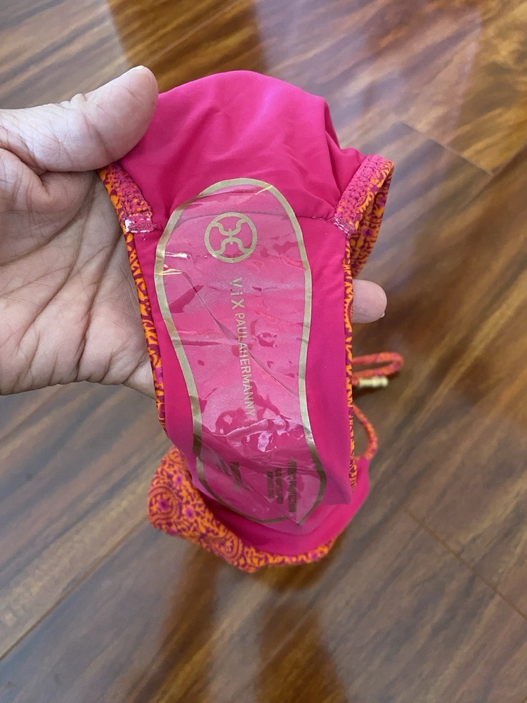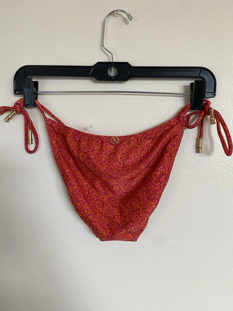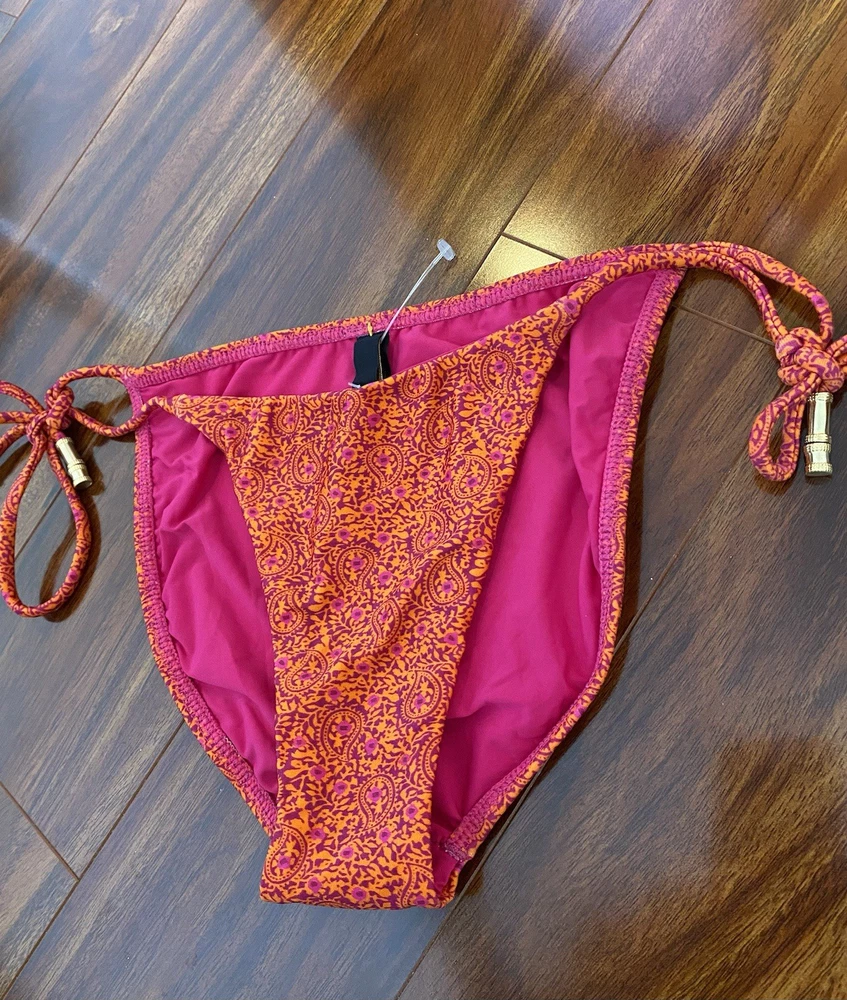 The Vix Paula Hermanny Bikini Bottom is a stylish swimwear piece featuring a vibrant floral pattern in pink and orange with gold accents. This bikini bottom is designed for women in size small, with a regular size type. The straps and beaded accents add a touch of elegance to the metal theme of the bikini, making it a fashionable choice for beach days or poolside lounging.