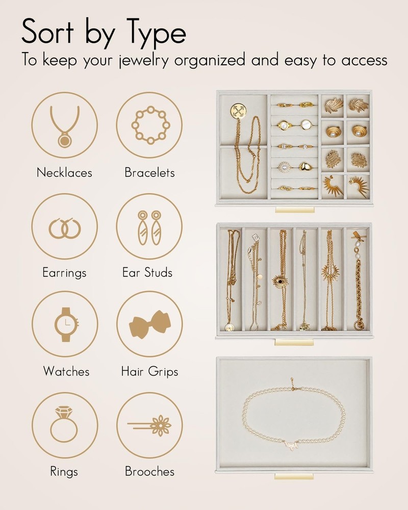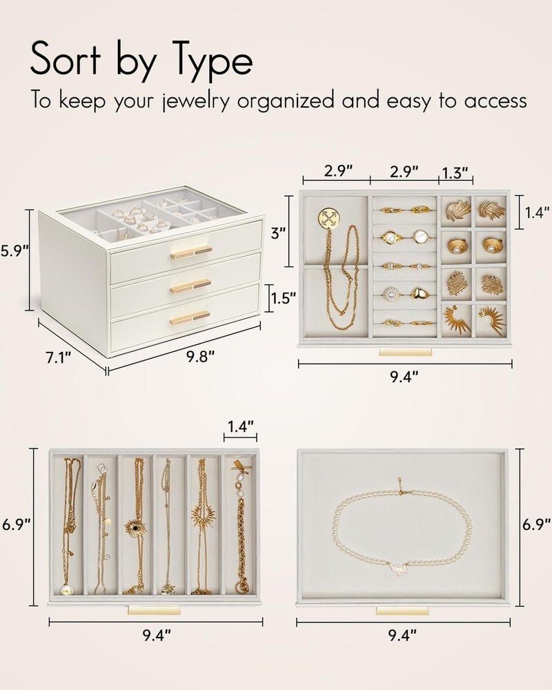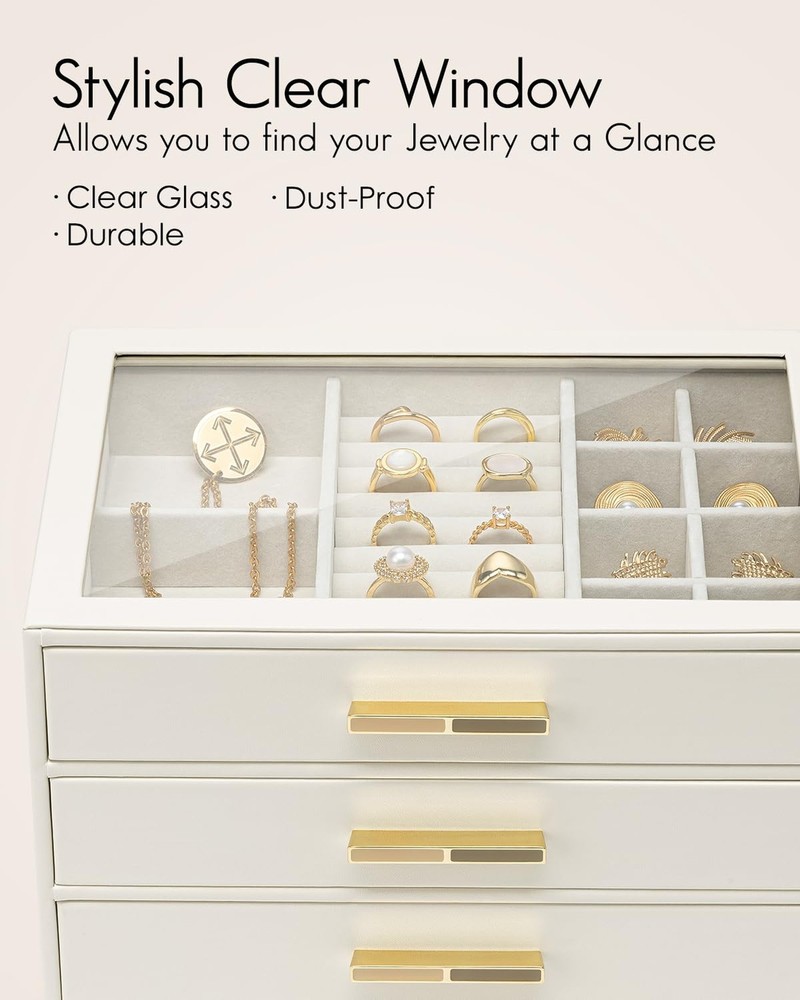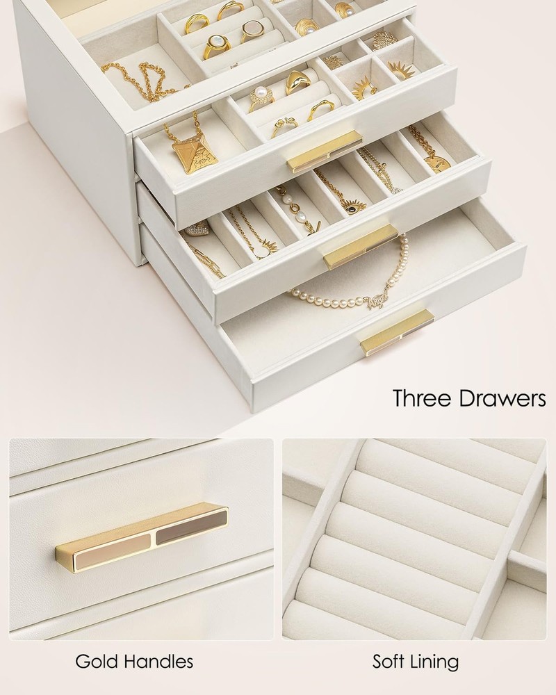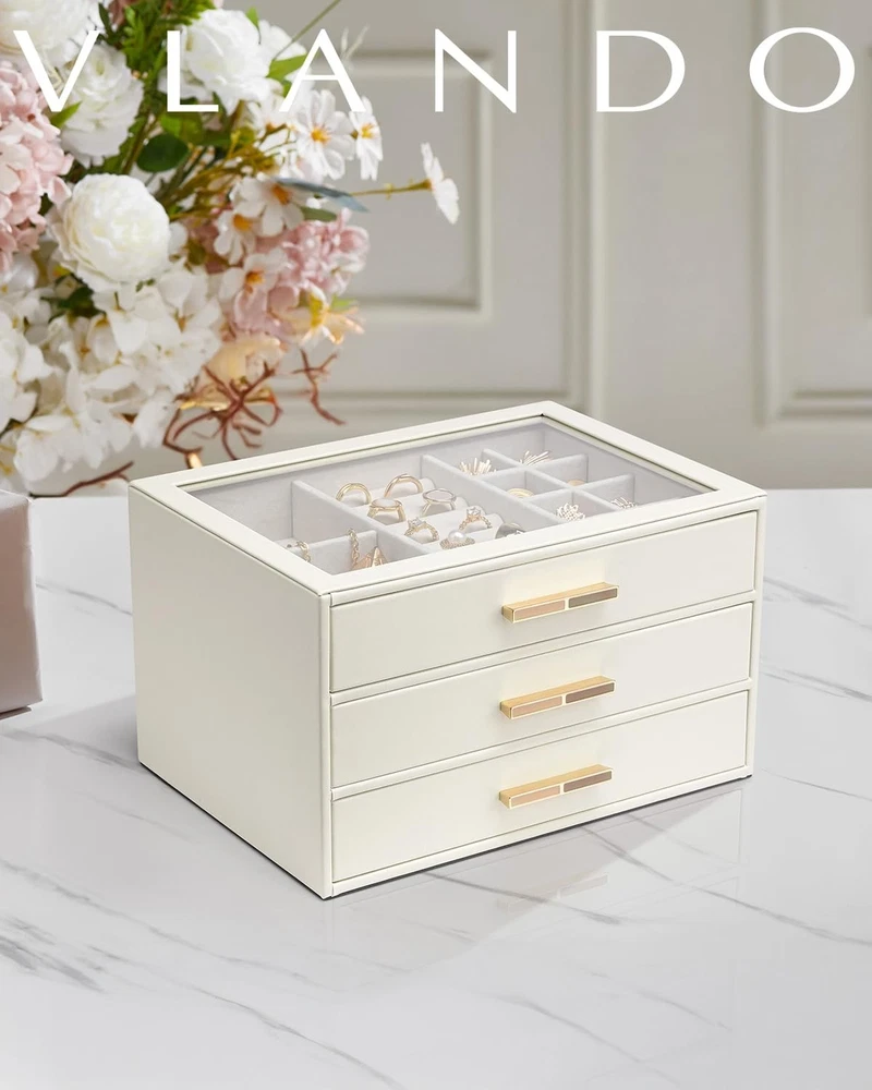 Vlando Jewelry Box for Women Girls,Jewelry Organzier,3 Drawers,Glass Lid Jewelry Organizer Storage for Gem Diamond Necklaces Rings Earrings Bracelets White - Buy Now with Fast Shipping! Vlando Jewelry Box for Women Girls,Jewelry Organzier,3 Drawers,Glass Lid Jewelry Organizer Storage for Gem Diamond Necklaces Rings Earrings Bracelets White Product Details Color: White Brand: Vlando Material: Faux Leather Style: Modern Special Feature: Adjustable Product Dimensions: 9.8"D x 6"W x 7.1"H Target Audience: Women Shape: Rectangular Finish Type: Polished Inner Material: Velvet Color: ‎White Brand: ‎Vlando Material: ‎Faux Leather Style: ‎Modern Special Feature: ‎Adjustable Product Dimensions: ‎9.8"D x 6"W x 7.1"H Target Audience: ‎Women Shape: ‎Rectangular Finish Type: ‎Polished Inner Material: ‎Velvet Number of Drawers: ‎3 Number of Compartments: ‎3 Jewelry Storage Type: ‎Jewelry Box Manufacturer: ‎VLANDO Occasion: ‎Memorial Day Mounting Type: ‎Table Top Closure Type: ‎Latch Item Weight: ‎4.77 pounds Size: ‎3 layer Finish: ‎Polished Special Features: ‎Adjustable Batteries Included?: ‎No Batteries Required?: ‎No Date First Available: September 29, 2024 Key Features ✅ CLEAR GLASS COVER: The large glass cover allows you to display your jewelry and find it quickly when you want to use it, and also prevents dust from getting in, so that your jewelry stays shiny; Size: 9.8''X7.1''X6'' ✅ 3 LAYERS JEWELRY BOX: this jewelry box has 3 layers, each layer has a different layout, small space layout can store your earrings, rings, brooches; large space design can store your bracelets, pearl necklaces, watches, etc., lined with velvet, can prevent your jewelry from friction; ✅ Jewelry to maintain the luster: more closed jewelry box, can effectively prevent the air in, can delay the problem of oxidation and blackened jewelry, so that your jewelry to maintain the luster; ✅ The best choice for gift giving: high quality material, exquisite workmanship, elegant appearance, the jewelry box comes with a gift card, you can write your blessings, do not need to buy an additional card; very suitable for birthdays, anniversaries, Christmas, New Year's Day, Thanksgiving Day as a gift for women, girls, wives, daughters, friends. ✅ MULTI-PURPOSE: The leather jewelry box can be placed on a vanity table or checkroom cabinet to store your earrings, necklaces, rings, brooches, watches and other accessories, and can also be placed in the living room as a display! Product Description