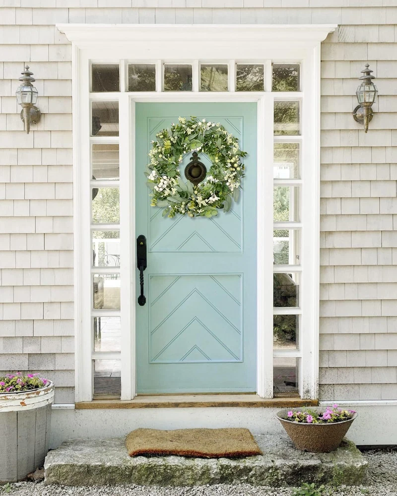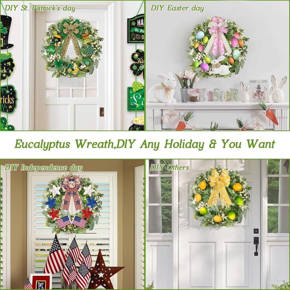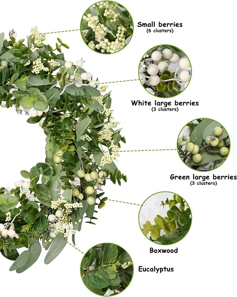 Vlorart Artificial Spring Summer Greenery Wreaths for Front Door Green Eucalyptus Leaf Wreath Decor Boxwood with Big Berries for Farmhouse Outside Year Round Item Description About this item 【All year round wreath】Available all year round:spring, summer, fall, and winter. Add themed decorations according to the festival, this is a flexible and versatile wreath. 【Full and realistic】 Vlorart's handmade green eucalyptus wreath features eucalyptus leaves, boxwood, white/green berries, andmany small berries embellishedon it, making the wreath full, natural and realistic. Its elegance add a vibrant and pleasant vibe to your home. 【Perfect Size】 This spring wreath is 19 inches in diameter. Each rustic farmhouse eucalyptus wreath is packed in a sturdy and exquisite box, suitable as a gift for friends. Note that because the wreath is compressed by the box to avoid being damaged during delivery, please fully stretch it to reach its maximum size. 【Versatile】This gorgeous wreath is a versatile decoration. It is suitable for all seasons of the year, spring, summer, fall and winter. You can add elements of each season on it, such as maple leaves, bells, etc. When you design it yourself, you will find that your wreath is the most unique scenery. It can be hung on the wall, front door, porch, bedroom, living room, etc. It is perfect for indoor and outdoor, weddings and parties. It's elegance is sure to impress your family and friends. 【Durable】Made of high-quality materials. Colors will never fade; leaves will never fall; berries will never rot. No watering and special cleaning required. Can be used for years to come. 【TIPS】 If you have any problem with our products, please contact us immediately,we will reply you ASAP. › See more product details This eucalyptus leaf wreath measures 18inch with realistic foliage and full berries.Ideal for front door, wall, fireplace, shop window, room decoration. This eucalyptus leaf wreath measures 18inch with realistic foliage and full berries.Ideal for front door, wall, fireplace, shop window, room decoration. Payment We accept payment only through PAYPAL Shipping We ship products worldwide through standard express courier service, it will reach within 7 to 10 days to abroad buyers, we ship the product after recieved clear payment and give full information about shipment to the buyer Return We accept product return within 7 to 21 days from delivery date but product should be in original position and not in damaged condition,the return shipping charges will be buyer responsibility