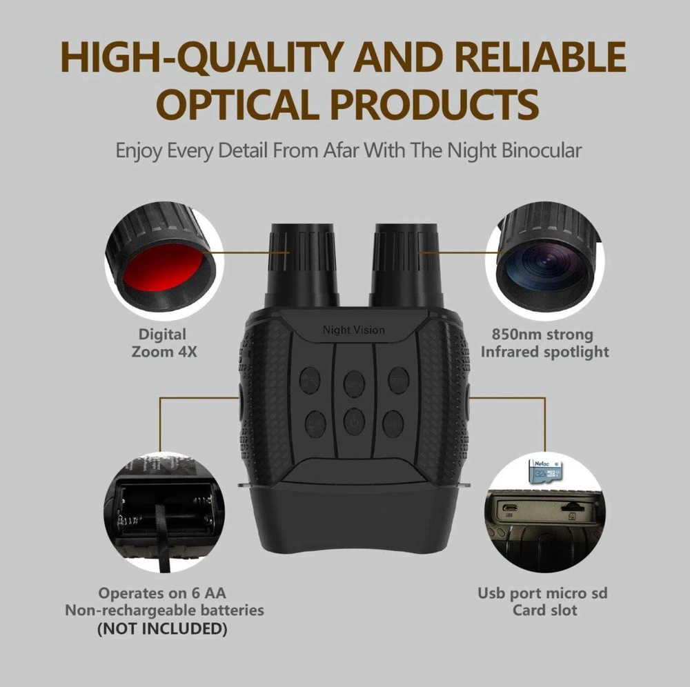 Photo Resolution: 1M(1280x960)by interpolation、VGA(640x480) Video Resolution: 960P(1280x960@30FPS )by interpolation、VGA(640x480@30FPS ) Lens: F1.2 larger aperture, f=25mm,Auto IR filter Lens Angle: FOV=10°,caliber is 24mm Display Screen: Inner screen is 2.31”960*240 TFT LCD, Outer screen is 98x48mm,with 5X large window magnifier Storage Media: Micro SD card, up to 32GB USB Port: Micro USB 2.0 MIC: NO Speaker: NO Auto off: 3 min/ 5 min/ 10 min/OFF IR LED: 3W,850nm strong infrared spotlight ,7 grades infrared adjustment View Distance In Complete Darkness: About 984ft/200-300 meters View Distance In Low Light: 118 inch/3 meters~infinity Digital Zoom: Digital Zoom 4X Power Source: 9V;6*AA alkaline, not include OSD Language: Multiple languages are optional Date Stamps : Support to set date and time. Date and time stamp on photo and video files. Operation Buttons: 6 buttons Operation Temperature: '-4F to +140F Storage Temperature: '-22F to +150F Dimensions & Weight: approx. 8*5.4*2.2inch /1.3lb Package List: Night Vision x1 Carrying bag x1 32G TF card x1 USB Out Line x1 Cleaning Cloth x1 Instruction x1 Strap x1