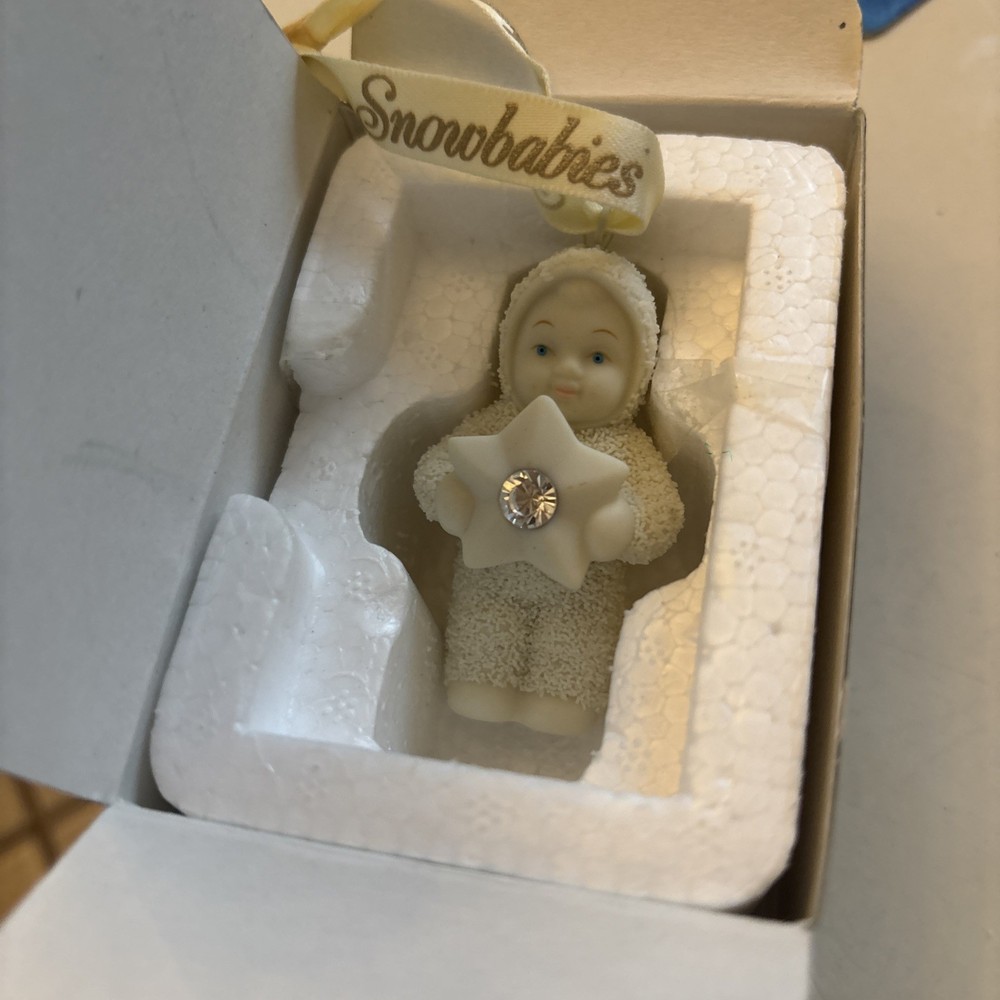 The Vntg 2000 Dept. 56 Snowbabies "Starshine" Swarovski Crystal Ornament is a charming addition to any Christmas decor collection. This small, ivory-colored ornament features a starshine character in slipcast porcelain, adorned with Swarovski crystals for a festive and elegant look. The hanging ornament comes in its original box from 2000 and is part of the Snowbabies collection by Department 56, perfect for adding a touch of holiday magic to any space.