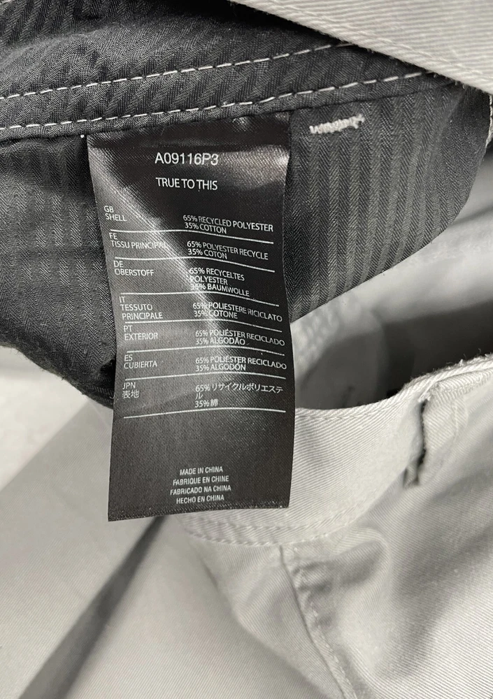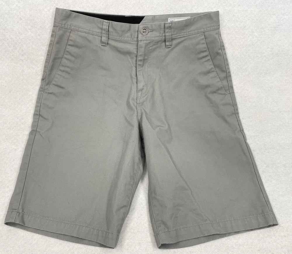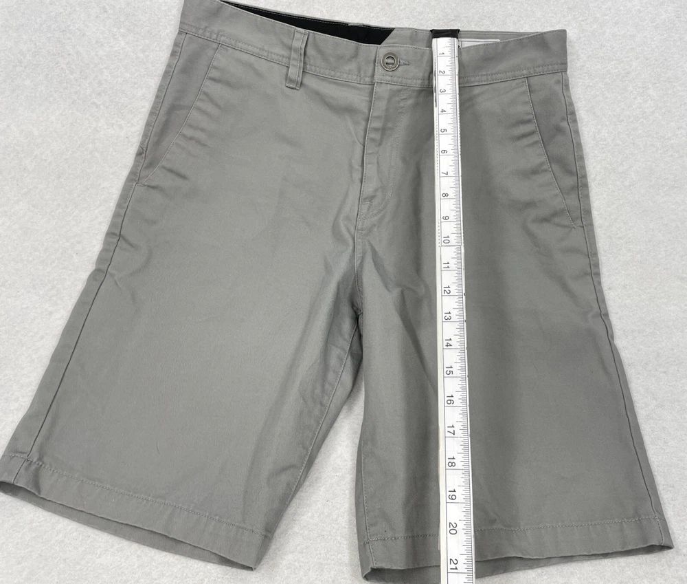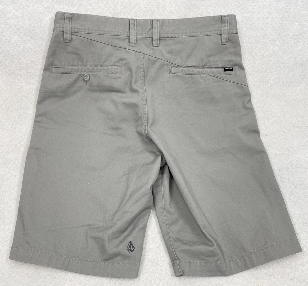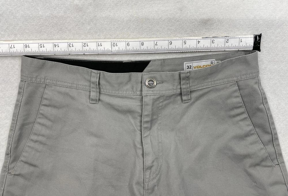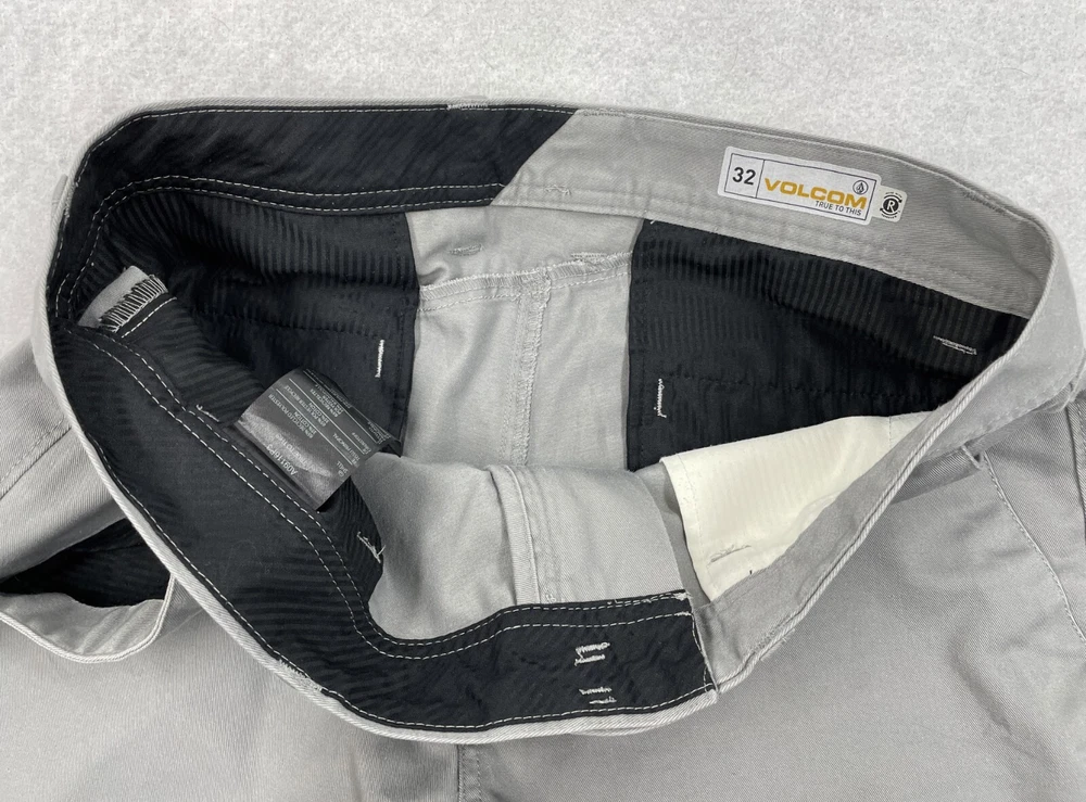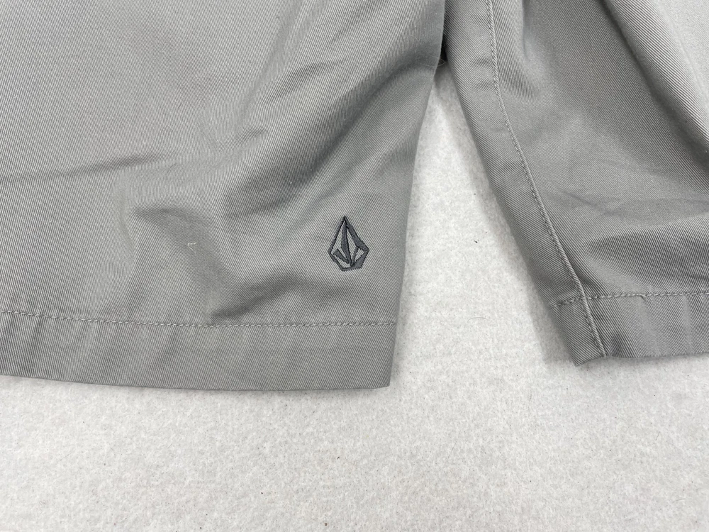Accents: Logo Material: Cotton, Polyester Pattern: Solid Size Type: Regular Size: 32 Closure: Button Department: Men Inseam: 9 in Waist Size: 32 in Style: Chino Brand: Volcom Fit: Regular Color: Gray Features: Pockets Occasion: Casual