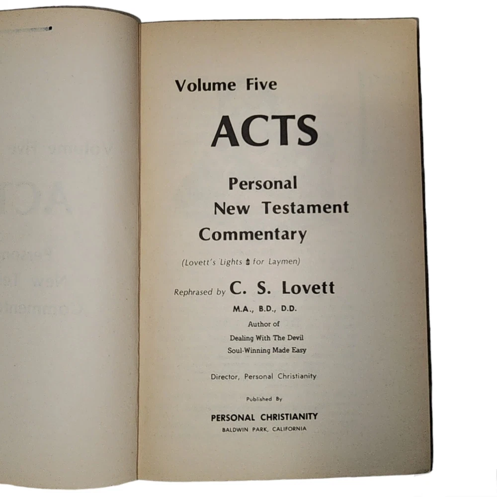 This Bible Volume Five Acts is a personal commentary by C.S. Lovett on the Book of Acts. It is a paperback edition written in English. The book title is "Volume Five Acts" and it falls under the genre of spirituality and religious & spiritual topics. The book is a great addition for those interested in comparative religion. It provides a detailed analysis of the Book of Acts and is perfect for personal study. Whether you are a student of Christianity or just seeking to understand the teachings of the Bible, this book is an excellent resource. Please see our other items. We do give multi item discounts, just let us know. Thank you for checking out our item today