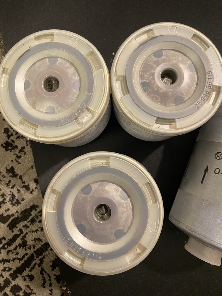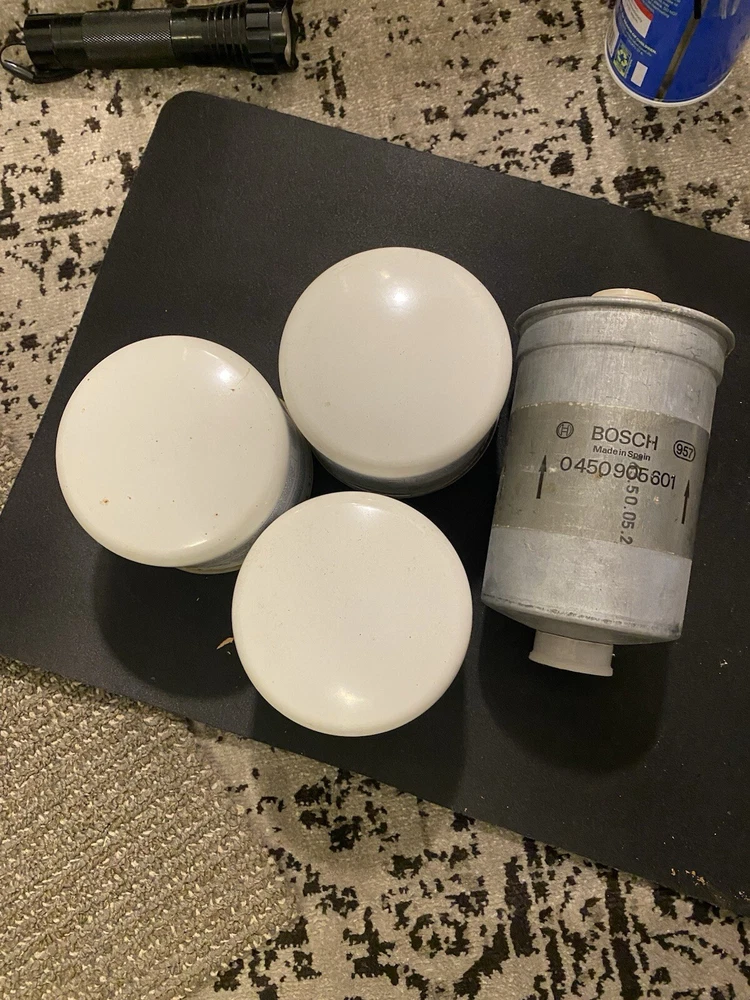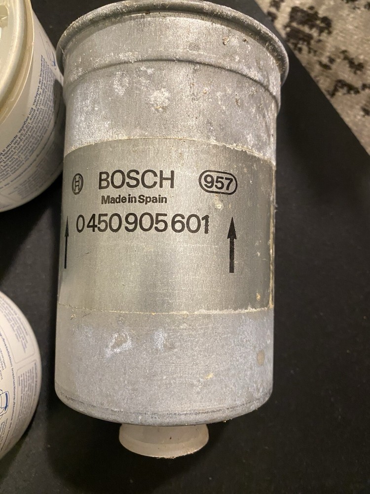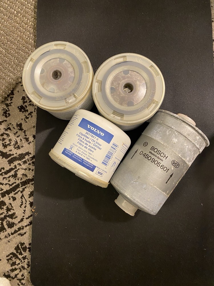 New Old Stock Genuine Volvo oil filters (3). New old stock genuine original equipment Bosch in-line fuel filter.