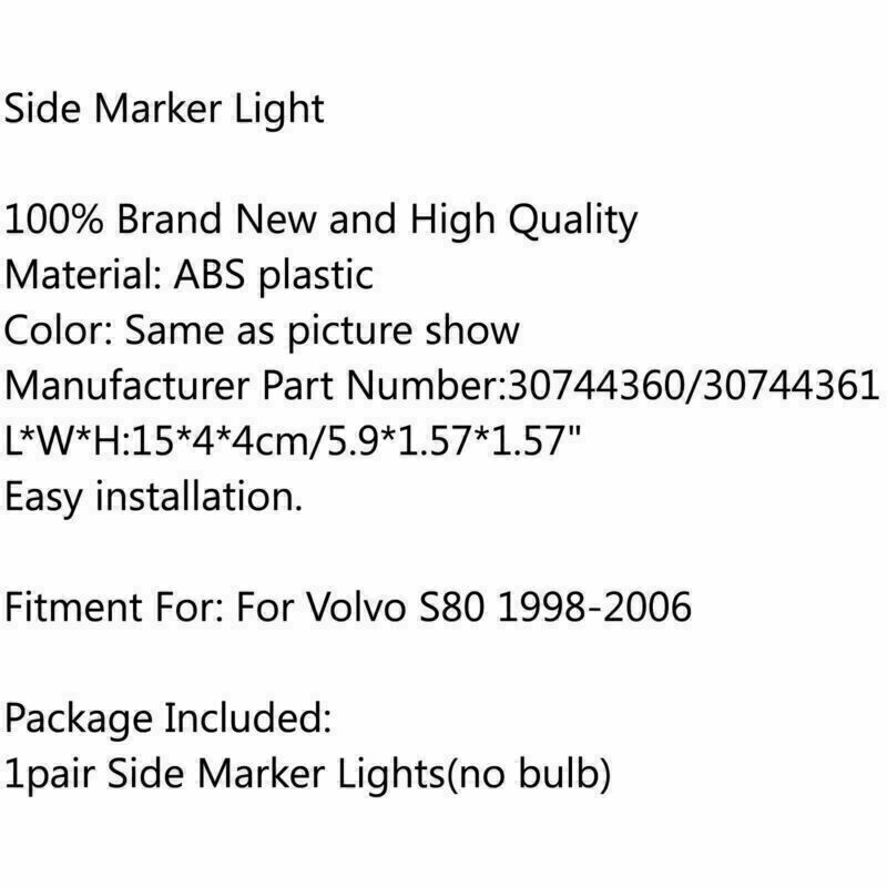 You may also like Control TMS Module Unit Adaptive Headlight 63117316217 For BMW F07 F10 53.69 USD Free shipping Left +Right Headlight Lens Plastic Cover Shell 4F0941003/04 For Audi A6 06-2011# 62.69 USD Free shipping Headlight Replacement Lens Driver Passenger L+R PAIR Fits For Corvet C6 05-13 Y8 75.69 USD Free shipping Xenon Ballast Kit 7237647 For BMW 5 series 528i 535i 550i 2011-2013 with TMS# 109.69 USD Free shipping Headlight Headlamp Lens Shell Cover Clear For Infiniti M25 M35 M37 M56 11-12 12 189.69 USD Free shipping Electric Headlight Conversion Kit Upgrade For Corvette C3 1968-1982 #8 235.69 USD Free shipping 2x DRL LED Module 63117343876 Fit for BMW 5 Series F10 F11 LCI 2014-2016# 32.69 USD Free shipping HID Xenon Headlight Ballast Control Unit 8K0941597E For Audi/VW .. 19.69 USD Free shipping 2*LED DRL Light Control Unit 63117214939/40 For BMW 5 Series G30 G38 2017- 49.69 USD Free shipping Chrome Clear Headlights Assembly For GMC Sierra 1500 2500HD 3500HD 2007-2014 99.69 USD Free shipping Xenon Ballast Kit 7237647 For BMW 5 series 528i 535i 550i 2011-13 with TMS 2012 125.69 USD Free shipping Headlight Cover Headlamp Lens Right For Audi A3 2013-16 13 Clear 49.69 USD Free shipping Right LED DRL Light Control Unit 63117214940 For BMW 5 Series G30 G38 2017 .. 25.69 USD Free shipping Headlight Bracket Set Left+Right 80A805608 80A805607 Fits Audi Q5 SQ5 2018-2020 69.69 USD Free shipping Xenon Ballast Kit 7237647 For BMW 3 Series E92 E93 328i 335i 2011-2013 119.69 USD Free shipping Headlight Replacement Lens Driver Passenger L&R PAIR Smoke Fit Corvet C6 05-13 Y 75.69 USD Free shipping All Models For Honda For Suzuki For Kawasaki For Yamaha For BMW For Polaris For CFmoto For Ducati For Benelli For Trident For Triumph For Aprilia Other part You may also like Front Footrests Foot Peg for YAMAHA FZ-07 FZ-09 FJ-09 FZ-10 XSR 700 900 FZ8 Red 27.69 USD Free shipping Carburetor Repair Rebuild Seal Kit fit Yamaha FZS 600 H N FZS600 Fazer 1998-2003 12.69 USD Free shipping Voltage Regulator For Victory V92 Cruiser Standard Sport Touring Deluxe 2002 US 70.01 USD 73.69 USD Free shipping 5% off Magneto Generator Stator Coil 31120-KCE-671 Fits Honda XR250R 1996-2004 60.69 USD Free shipping Long Brake Clutch Levers For Buell XB12 XB9 Ulysses XB12XT XB12X Black #8 28.69 USD Free shipping PRODUCT DESCRIPTION Side Marker Light 100% Brand New and High Quality Material: ABS plastic Color: Same as picture show Manufacturer Part Number:30744360/30744361 L*W*H:15*4*4cm/5.9*1.57*1.57" Easy installation. Fitment For: For Volvo S80 1998-2006 Package Included: 1pair Side Marker Lights(no bulb) About Us Payment Shipping Returns Contact Us About VIPIH VIPIH is one of the international leading distributors specialized in distribution of motor parts of the world's prime motorcycle part suppliers on a global scale with the full responsibility in procurement, shipping, sales and marketing and after sales service. VIPIH fulfills all needs of its clients completely and on a timely basis with the know-how it has built up since it was established and the comprehension knowledge of the sectors standards. The perfectionist approach in product quality, high service availability, strict principle of business follow-up, reliability and the good reputation which has gained strength as a result of customer satisfaction are the most striking components of VIPIH's success. VIPIH is presently capable of supplying all demands for motor parts from the petrol pump to rectifier in a wide range. Free delivery with worldwide shipping options available. If you need any further information before ordering,please get in touch with expert advice. About Item All items sold by us are being described to the best of our abilities, as accurate as possible, and with utmost conscientiousness on our part. However, to avoid any potential oversights, I respectfully request your assistance in helping us to make this a mutually satisfactory transaction by THOROUGHLY reviewing item description and photos, and asking all questions PRIOR TO BIDDING. Customer Satisfactory 1.We back our commitment with superb service, 100% full money back and a customer satisfaction guarantee. 2.I am here and ready to assist you with any questions or concerns you might have before or after the purchase. 3.My goal is to make sure you are a happy customer and pleasant shopping with us. Feedback If you are satisfied with the purchase and our total service, your comment is very important in our business success. Please take a minute to leave us a positive feedback with an overall Detailed Selling Rating (DSR) of 5. Our eBay account setup auto feedback, so eBay system gives you automatically Positive feedback back after your positive feedback left. If you plan to give us a neutral/negative feedback Or open ebay/paypal case, please write to us immediately so that we can do our best to resolve your problem. 1.We only accept PayPal. 2.PayPal is the only online payment method we accept. Please make sure you have a valid/confirmed PayPal account prior bidding. 3.Payment must be made within 3 days of the auction end time. Non-Paying bidders will be reported. 4.Our eBay account automatically open a dispute for a unpaid item, when we don't receive your payment after 4 days. United States Buyers Parcel will via USPS or UPS from us United States warehouse Shipping Time Usually ,Parcel will be delivered 2-10 working day include Handling time. Sometimes shiping time may has a little delay, such as Bad wether,Holidays We stand behind everything that we sell and will do everything possible to assure you are satisfied. When you receive your purchase if you are not 100% satisfied, please sent me ebay message and we will do our best to make you happy. If you still want to return your purchase, simply ship the item(s) back to us and we will refund your original purchase price and the original shipping charge. Buyers are responsible for the postal cost of returning the items. We must be notified o
