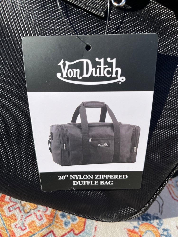 This is a Von Dutch duffle bag in black color made of nylon material. It has a zipper closure and measures 20" long, 10" tall, 9" deep. The bag features an adjustable Shoulder Strap and 2 padded handles. There are an additional 2 side zipper compartments. It is brand new with tags.