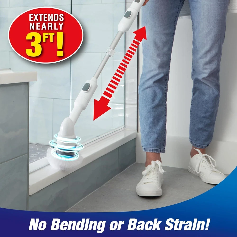 DETAILS Strong Bathroom Instrument: With its 5.5W motor and 300 RPM speed, the Voom Electric Spin Scrubber offers a practical and effective method of removing stains and grime from bathtubs, showers, sinks, floors, baseboards, automobile wheels, and other surfaces. Portable and Adaptable Design: Reach low places and high corners with ease and without strain or bending. The handle of the electric scrubber may be adjusted from 19" to 34", and its lightweight construction makes it comfortable to use. Long Battery Life & Cordless Convenience: The rechargeable 1300mAh battery allows for up to 60 minutes* of run time. Convenience and accessibility are the main goals of the cordless design. includes instructions and a USB-C charging cable. Adaptable Cleaning Brushes: For messes and curved surfaces, alternate between heavy-duty and all-purpose brush heads.