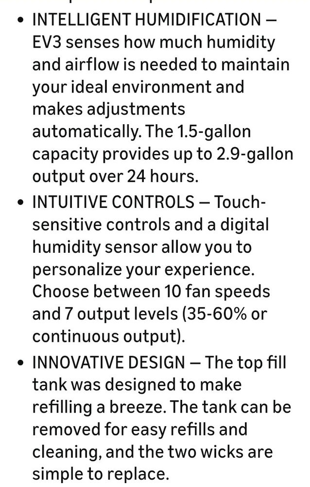 Vornado EV3 Whole Room Evaporative Humidifier, 1.5 gal Capacity, Electronic Humidistat, Top Fill Tank, Easy To Clean This unit is in excellent, like-new condition and was used once briefly for testing purposes only. It has been fully tested and works perfectly as intended. ✔️ Fully functional ✔️ Clean and well maintained ✔️ No cracks, damage, or repairs ✔️ Ready for immediate use Item will be carefully packed and shipped securely. Please review all photos carefully, as they are part of the description. If you have any questions, feel free to message me before purchasing. bra 068 km