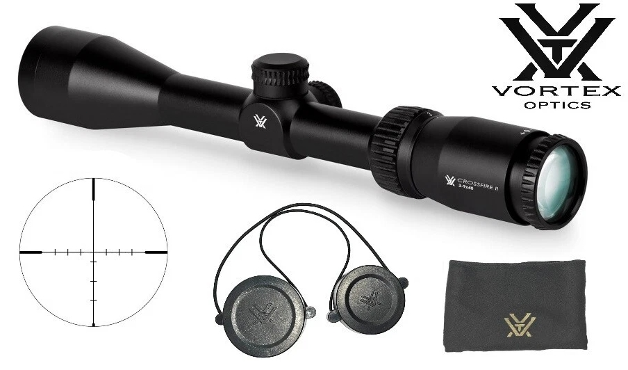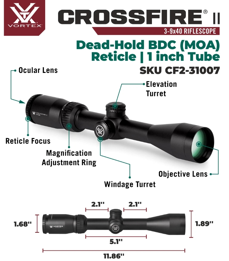 Brand New Vortex Crossfire II 3-9x40 Dead-Hold BDC 1" Riflescope - CF2-31007 The Vortex Crossfire II 3-9x40 Riflescope offers a great magnification range and large objective lens ideas for hunters, all at an affordable price point. Packed with features, your Crossfire scope has fully multicoated optics for bright, clear images, and a fast focus eyepiece to get you on target quickly. Long eye relief makes for comfortable viewing, even when wearing glasses. Designed to withstand the great outdoors, your Vortex Crossfire II scope has a strong, durable single piece aluminum tube that's waterproof and fog proof. Features SPECIFICATION Magnification 3x-9x Objective Lens Diameter, mm 40 Field of View (FOV) @ 100yds, ft 34.1-12.6 Eye Relief, in 3.8" Tube Size, in 1" Turret Style Capped Adjustment Graduation, MOA 1/4 Travel per Rotation, MOA 15 Max Elevation Adjustment, MOA 60 Max Windage Adjustment, MOA 60 Parallax Setting, yds 100 Reticle Dead-Hold BDC Length, in 12" Weight, oz 15