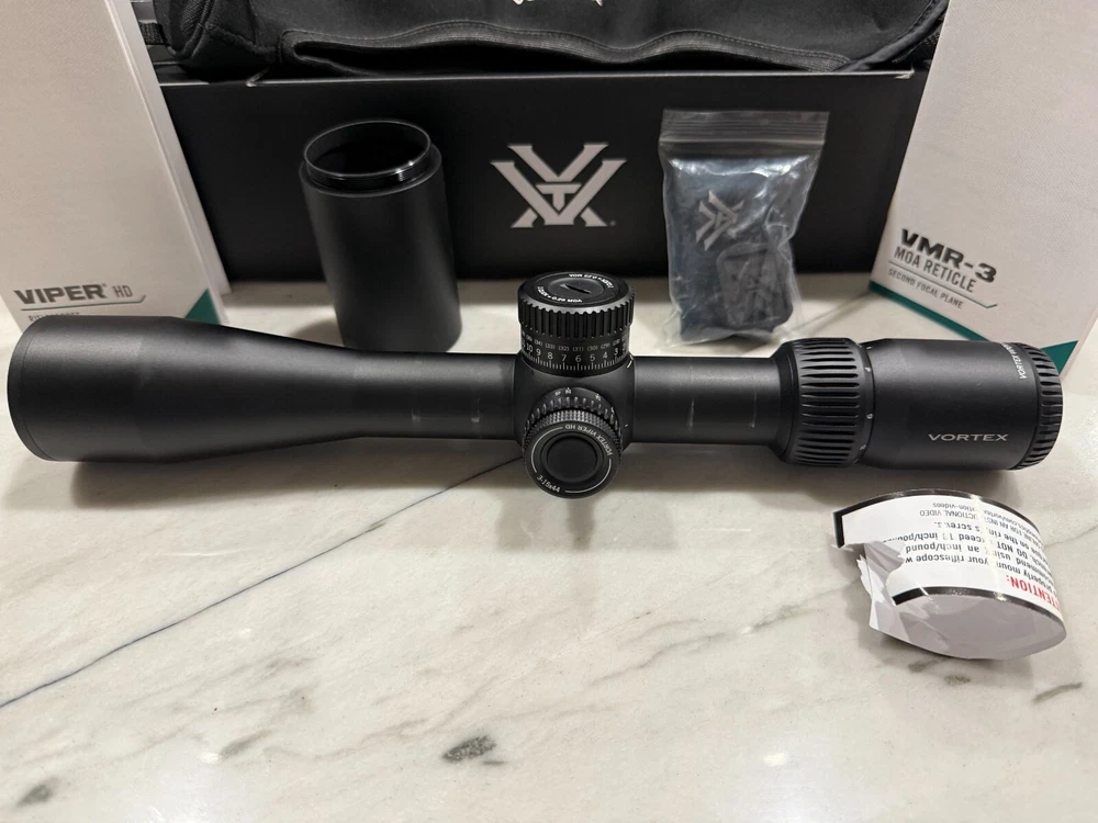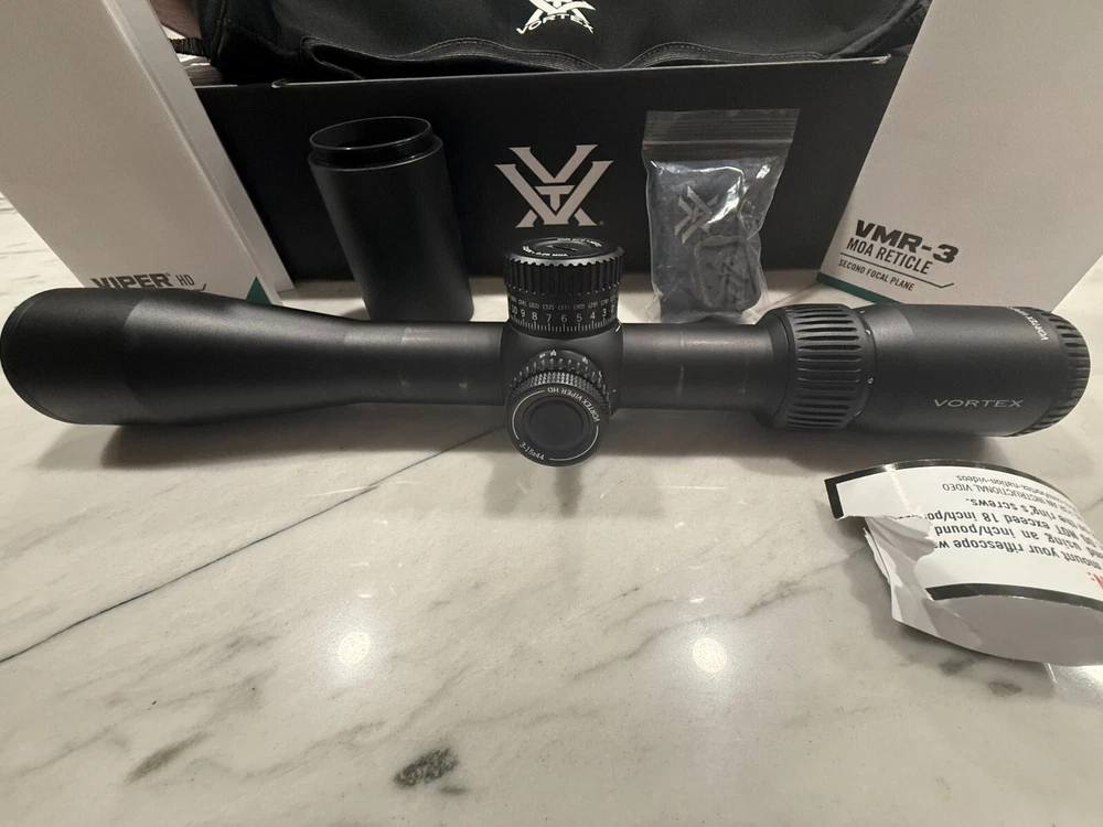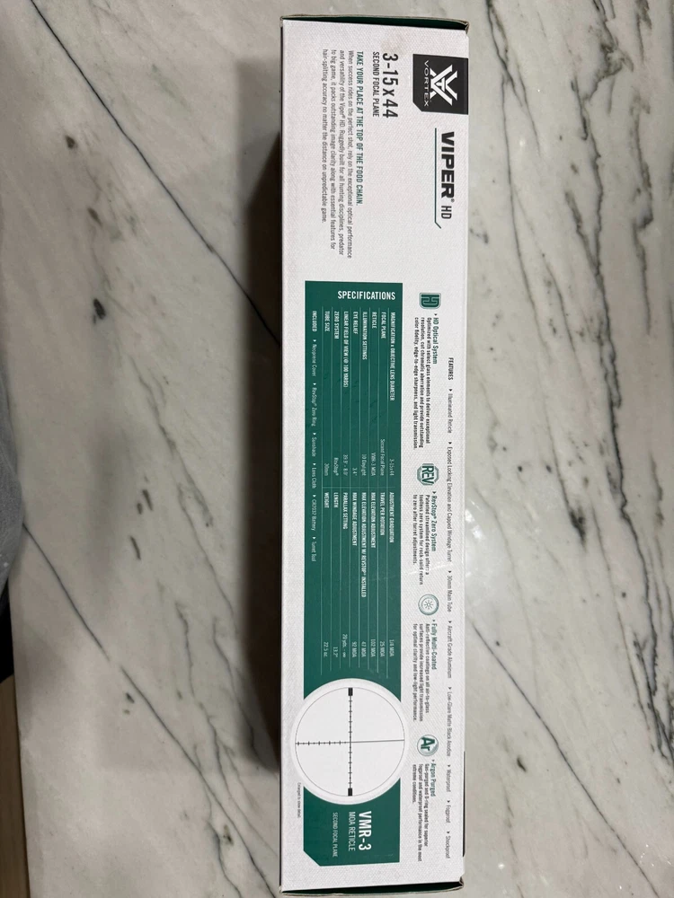 The Vortex Viper HD Riflescope 3-15x44 ILLUMANATED RETICLE. It features a VIPER model with a maximum magnification of 15x and a VMR-3 MOA reticle in the second focal plane (SFP). It is a high-quality riflescope from the Vortex brand, ideal for hunting and sporting activities. I had this mounted, shot 10 rounds and replaced with same scope in MRAD. Slight marks where mounting rings were located, but you will never notice once mounted on rifle (see photos).