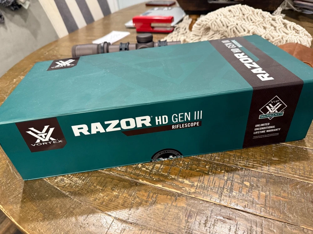 Item Height: 4in. Range: 34mm Model: Gen III Features: Fixed Magnification Item Width: 10.8in. Reticle Color: Red Sport/Activity: Hunting MPN: RZR-11002 Tube Diameter: 34 mm Type: Hunting Scope Reticle Type: Illuminated Objective Lens Diameter: 24 mm Maximum Magnification: 10x Brand: Vortex Mounting: Barrel Clamp Item Weight: 3.88lbs. Item Length: 17.4in. Color: Brown For Gun Type: Rifle