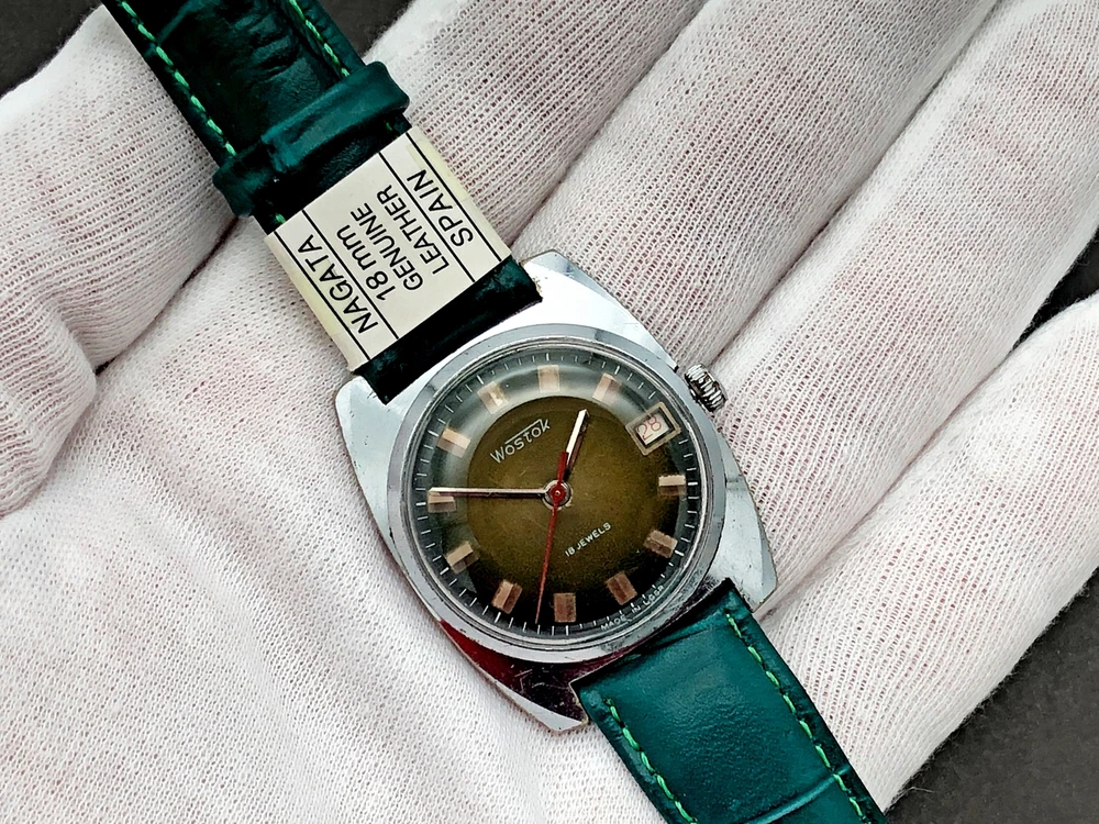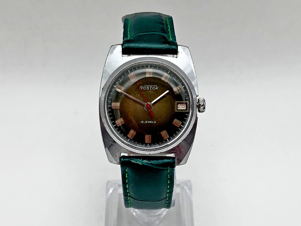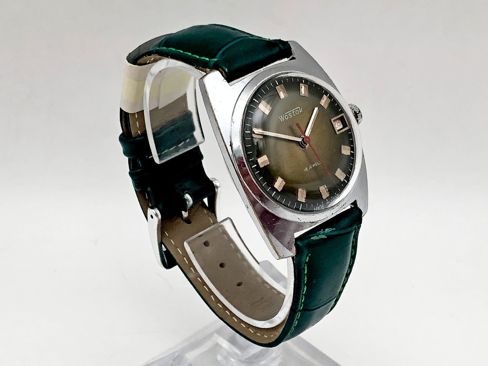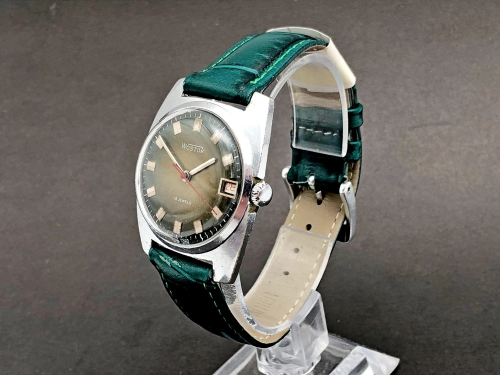 WOSTOK 2214 Vintage Wristwatch Vostok SU 18 Jewels USSR Serviced Watch Dark Green Dial, Green Leather Band, Calendar. Produced by the Chistopol Watch Factory Keeps good time and works well. Some age traces. Brand new leather band as a gift. See photos. Could be a great gift for someone you love or can be added to your collection. Contact me if any questions. I do offer combine shipping discount if you buy 2 items or more. I make shipments the next business day after the purchase. Buyer protection is in effect. Please watch the photos carefully as they are important part of description. Thanks for your interest. Have a look at some other lots at our store. 💛💙