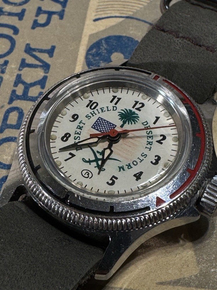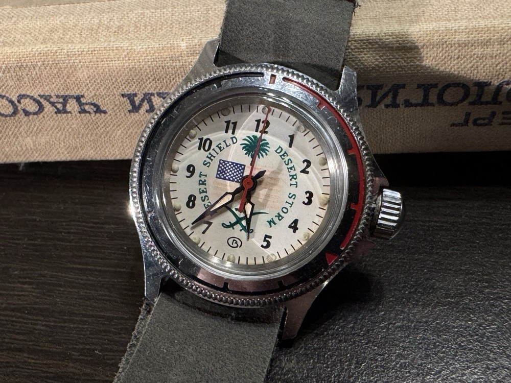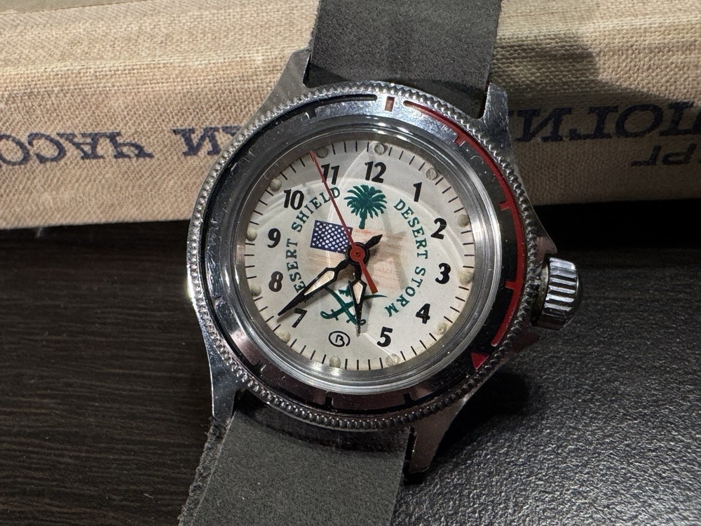 The Vostok Desert Shield Operation Commanders Junior Soviet Watch USSR is a vintage wristwatch with a silver case and silver bezel, featuring Arabic numerals on the beige or multicolor dial. This manual mechanical watch has a screwback caseback and a leather band with a lug width of 18mm. With features like central second, acrylic crystal, and 12-hour dial, this watch combines elements of dress/formal, casual, classic, and military styles. Made in the USSR during the 1990s, this watch does not come with original box/packaging or service records.