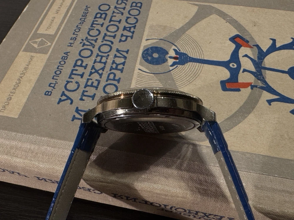 The Vostok Komandirskie Commanders Soviet Military Watch USSR is a vintage wristwatch from the 1980s, featuring a classic round design with a gold brass case and left-handed movement. It has a blue dial with no hour marks, a central second hand, and an acrylic crystal. The watch comes with a bracelet band in blue leather with an 18mm lug width. With its military-style and dress/formal design, this Vostok watch is a unique and collectible piece that pays homage to the Soviet era.