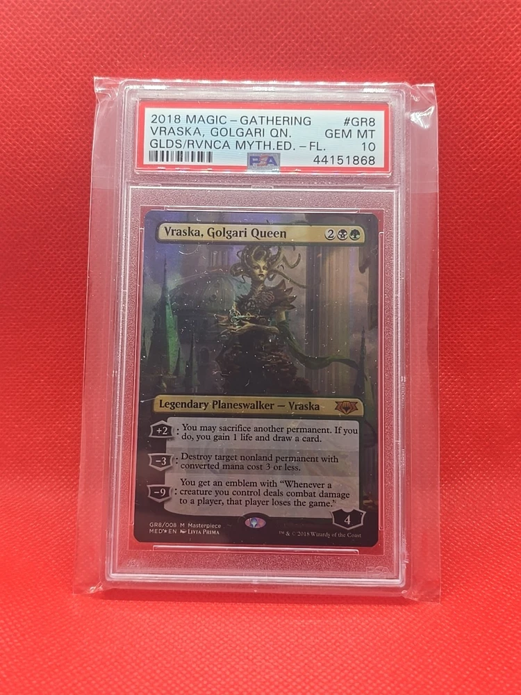 Elevate your Magic: The Gathering collection with the Mythic Edition: Guilds of Ravnica Foil card featuring the formidable planeswalker, Vraska, Golgari Queen. This card, adorned with Livia Prima's evocative artwork, showcases a stunning foil finish that catches the light to mesmerize opponents and onlookers alike. As a key piece from the Guilds of Ravnica set, the card is presented in English and boasts the rare Mythic rarity. With its distinct black and green color identity, Vraska, Golgari Queen becomes an essential addition for players seeking to harness the strategic depth and power of the Golgari guild. PSA 10