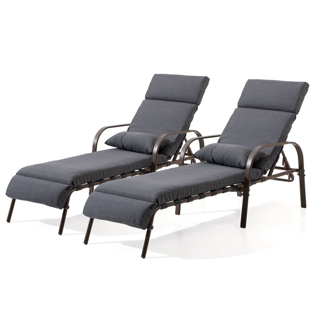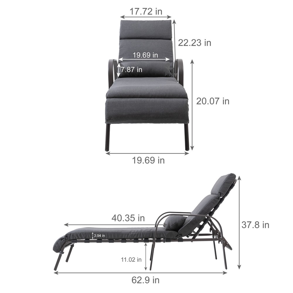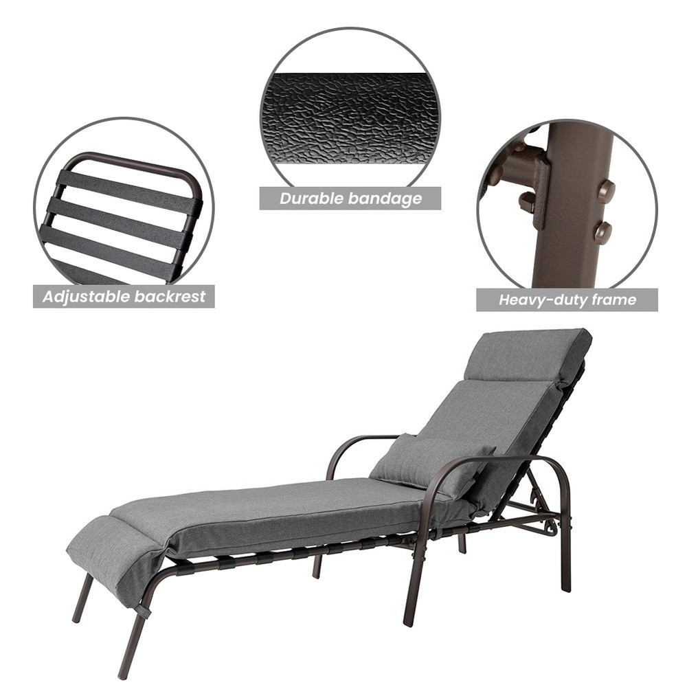 Relax outdoors with this outdoor adjustable chaise lounge chair from VredHom. Full steel frame is sure to be a reliable Patio Furniture for your home. Adjustable back height and you could even lay flat to enjoy sunbathing. Easy assembly required. Enjoy Your Life! Features: Set includes 2 chaise lounges with cushions and pillows Steel frame in brown powder coated Removable cushion and pillow 5 adjustable recline positions Ergonomic design Easy to assemble Holds 350 lbs. Dimensions: The highest position: 63 inches long x 19.7 inches wide x 38.1 inches high Backrest: 29 inches long x 17.7 inches wide Cushion: 79.92 inches long x 19.69 inches wide x 3.94 inches thick Pillow: 19.69 inches long x 7.87 inches wide x 3.94 inches thickWarm Tips: After assembling the chair, it's Free Shipping Over $49.99* Details VredHom Outdoor Adjustable Chaise Lounge with Cushion and Pillow (Set of 2) - Product Description: Relax outdoors with this outdoor adjustable chaise lounge chair from VredHom. Full steel frame is sure to be a reliable Patio Furniture for your home. Adjustable back height and you could even lay flat to enjoy sunbathing. Easy assembly required. Enjoy Your Life! Features: Set includes 2 chaise lounges with cushions and pillows Steel frame in brown powder coated Removable cushion and pillow 5 adjustable recline positions Ergonomic design Easy to assemble Holds 350 lbs. Dimensions: The highest position63 inches long x 19.7 inches wide x 38.1 inches high Backrest29 inches long x 17.7 inches wide Cushion79.92 inches long x 19.69 inches wide x 3.94 inches thick Pillow19.69 inches long x 7.87 inches wide x 3.94 inches thick Warm Tips: After assembling the chair, it's normal that the middle leg of the chair is suspended, such a design is to avoid the middle leg of the chair touching the ground, leading to the front and back legs may be suspended, the whole chair can not balance. The middle leg, which is suspended, is normal and has been designed for better balance. But once you sit on it, the middle leg touches the ground, so please customers don't have to worry.