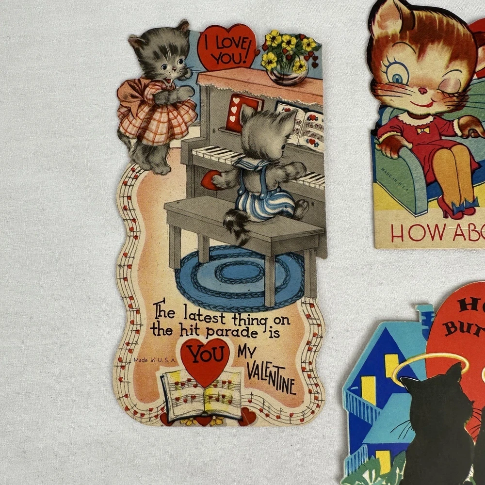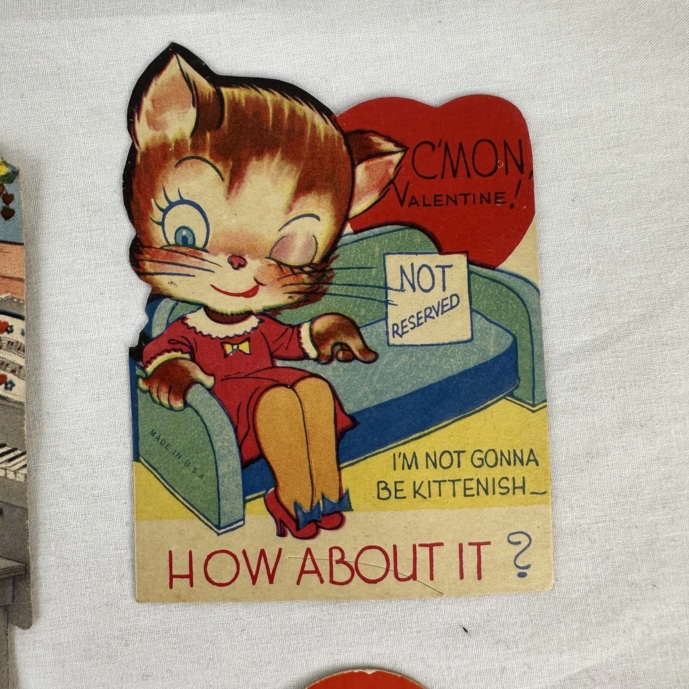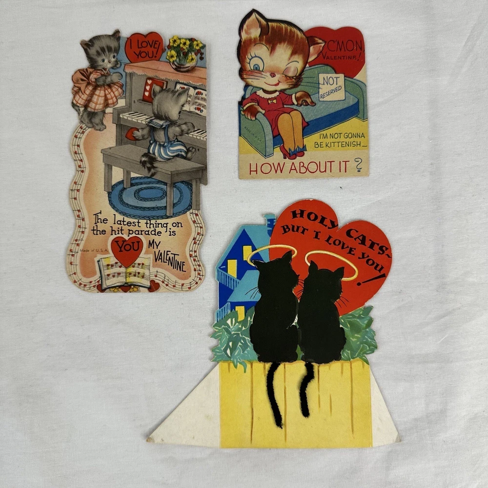 Vtg 1940s Valentine Cards Lot (3) WWII Era Cars Kittens Kittie Kittenish Die Cut These cards have wear and have been written on. See photos for wear and inscriptions. WWII era.