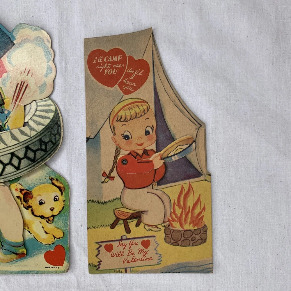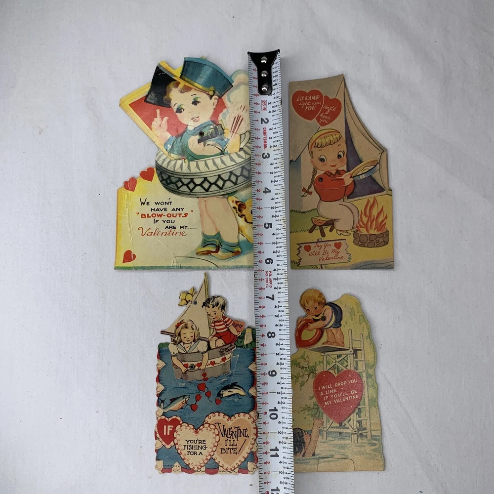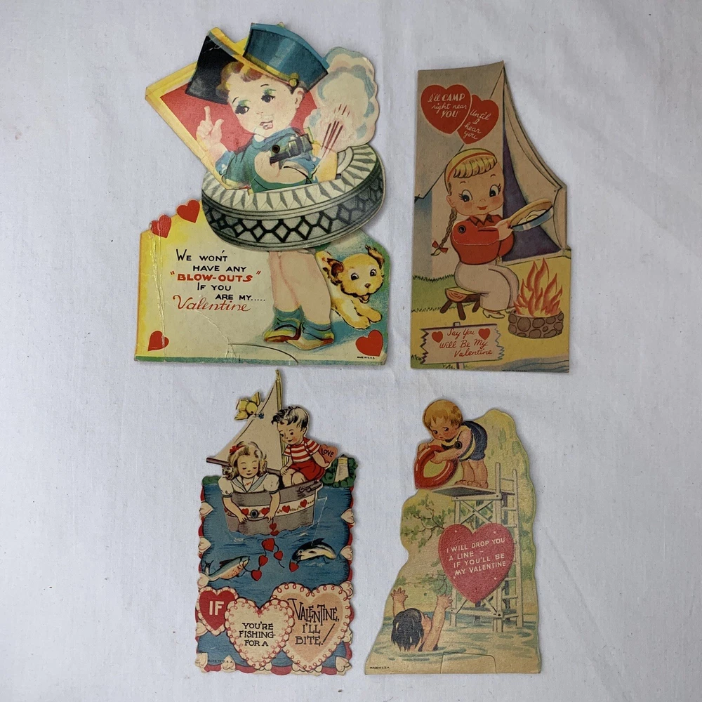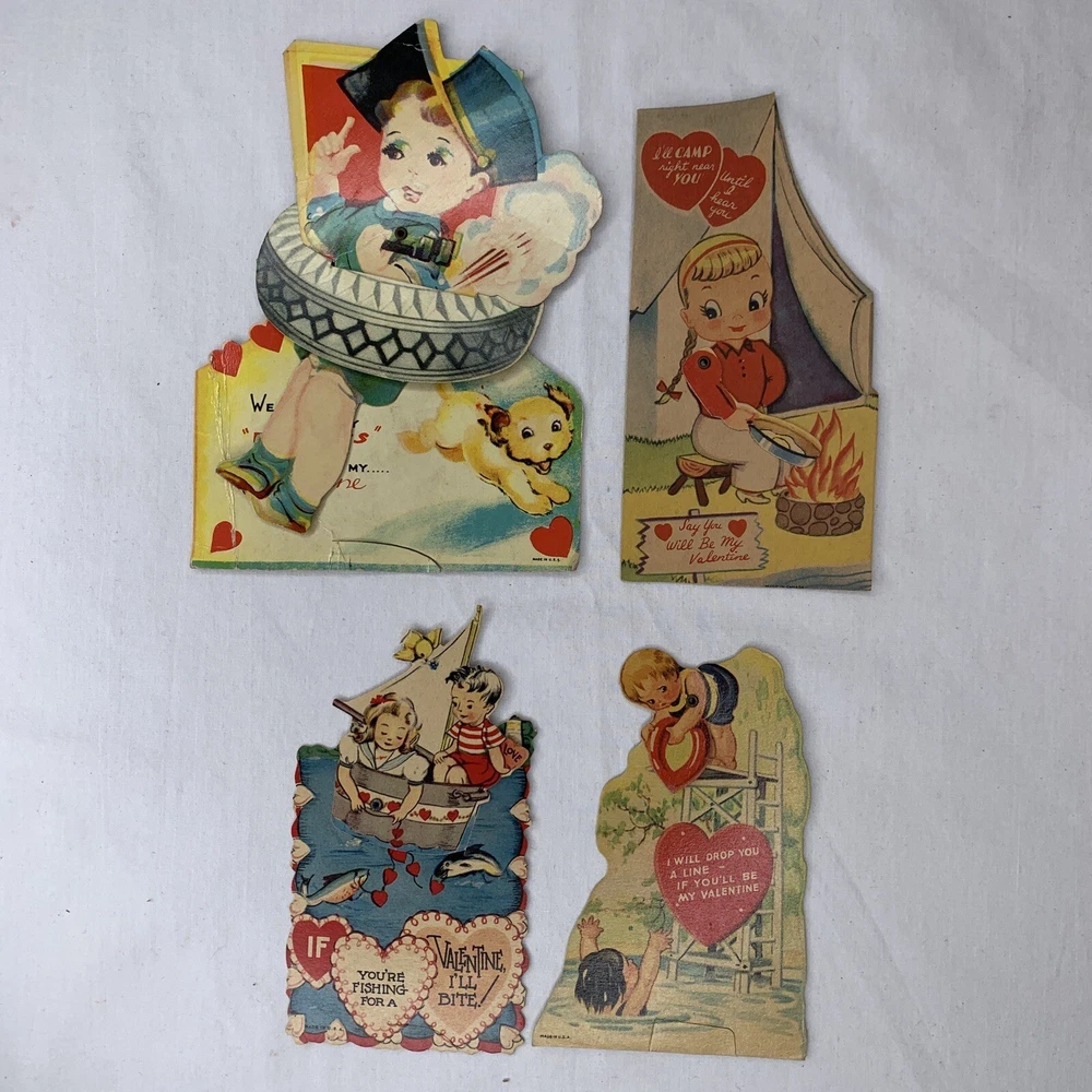 Vtg 1940s Valentine Cards Lot (4) Moving Mechanical Kids Outdoors Camping Swimming boating tires. These cards have wear and have been written on. Made in the USA. See photos for wear and inscriptions. WWII era.