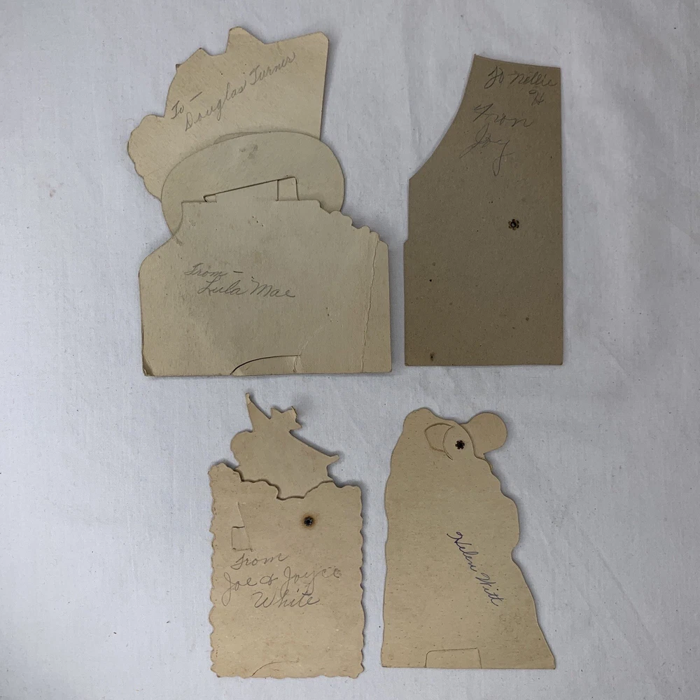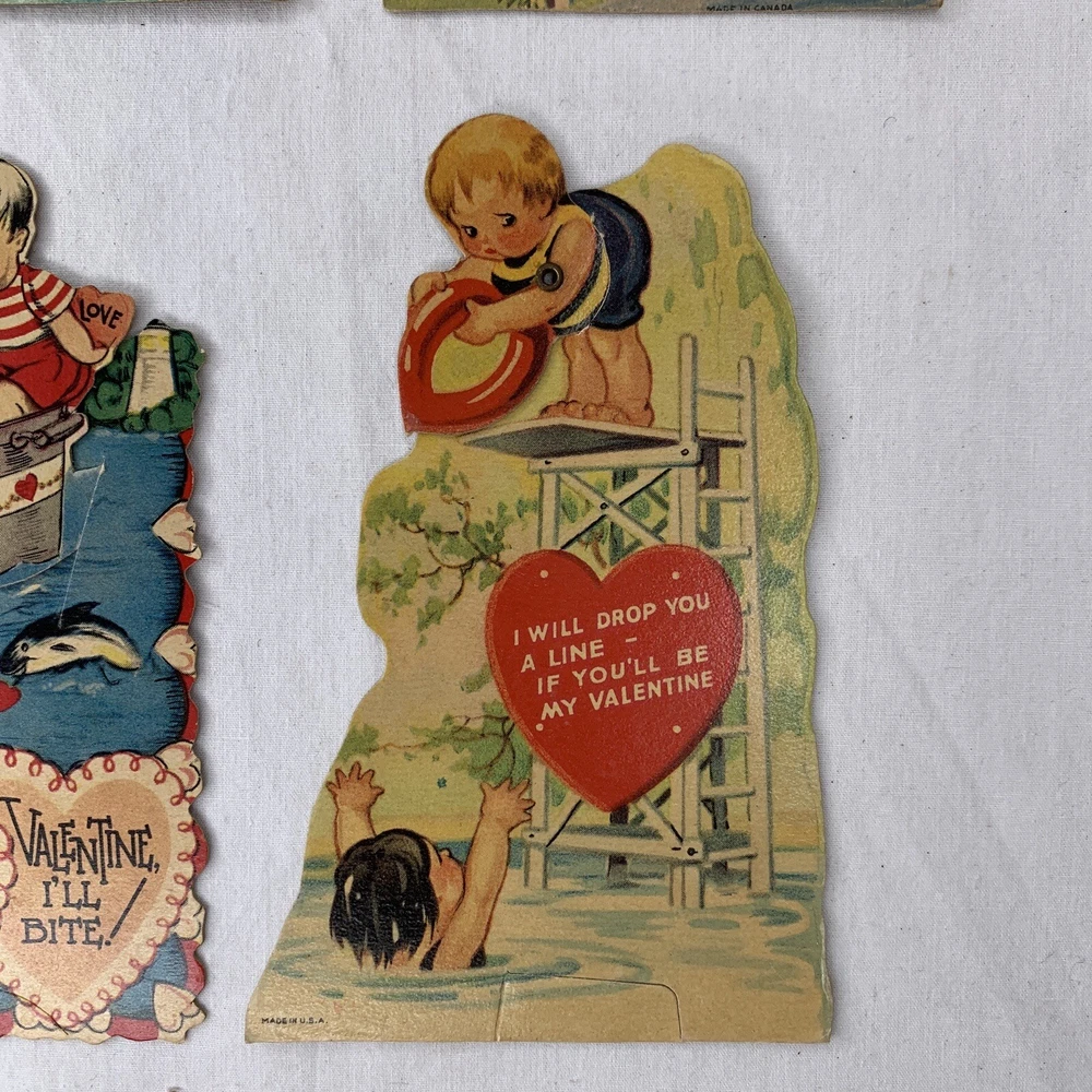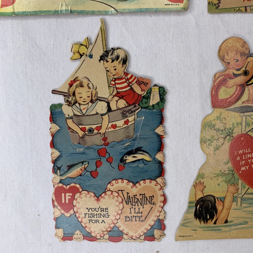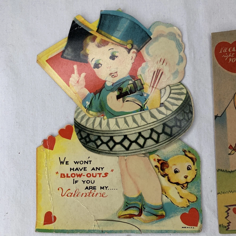 Vtg 1940s Valentine Cards Lot (4) Moving Mechanical Kids Outdoors Camping Swimming boating tires. These cards have wear and have been written on. Made in the USA. See photos for wear and inscriptions. WWII era.