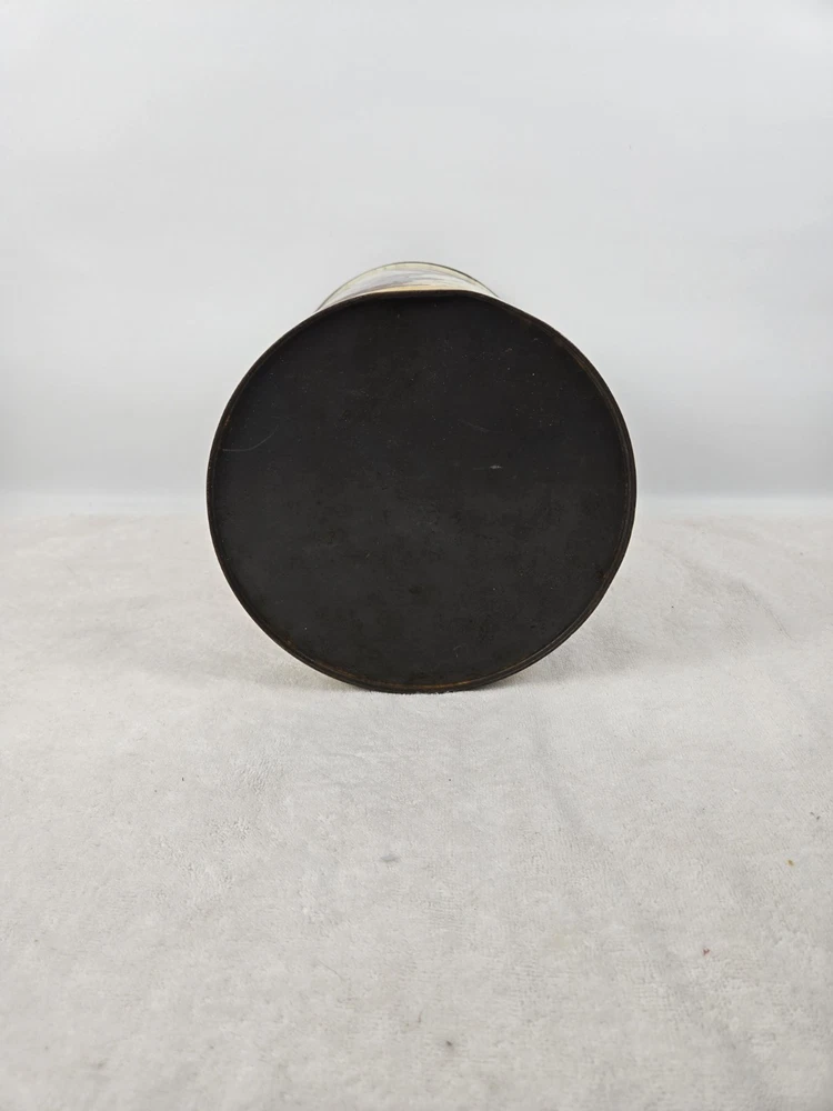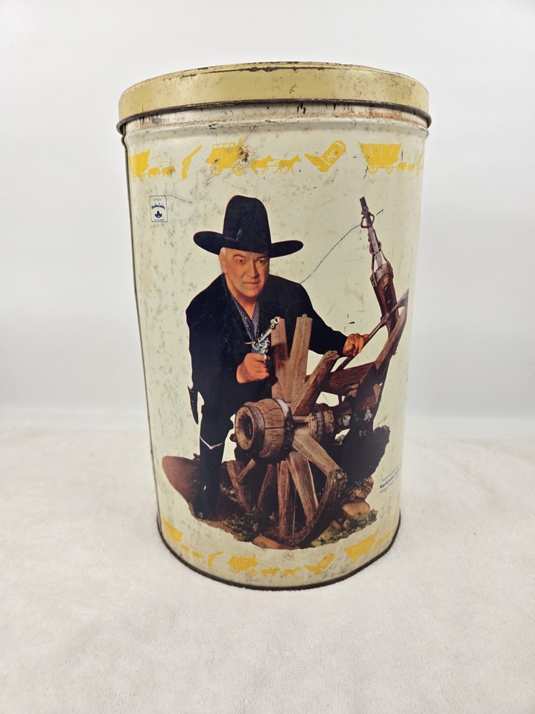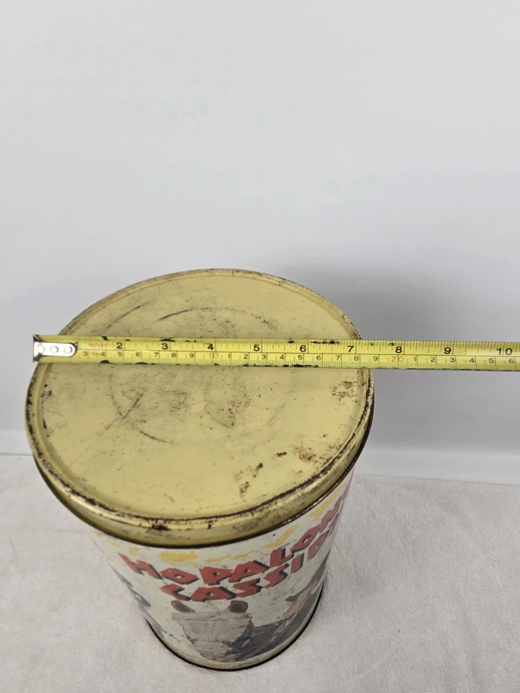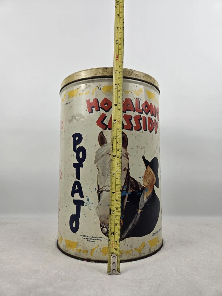 A vintage Hopalong Cassidy potato chip tin . The tin features an image of actor William Boyd as the cowboy hero Hopalong Cassidy, alongside his horse Topper. These tins were produced around the 1950s, a period when Hopalong Cassidy merchandise was highly popular. They were manufactured by companies like Kuehmann Foods in Chicago and Toledo. This tin is pre-owned so please see all the pictures for your consideration. All pictures are considered as part of the description as well. If you should have further questions or concerns please ask Thank you