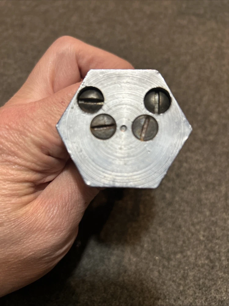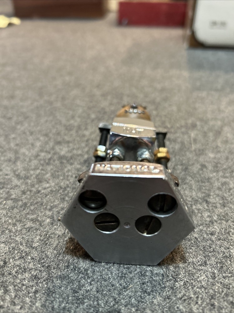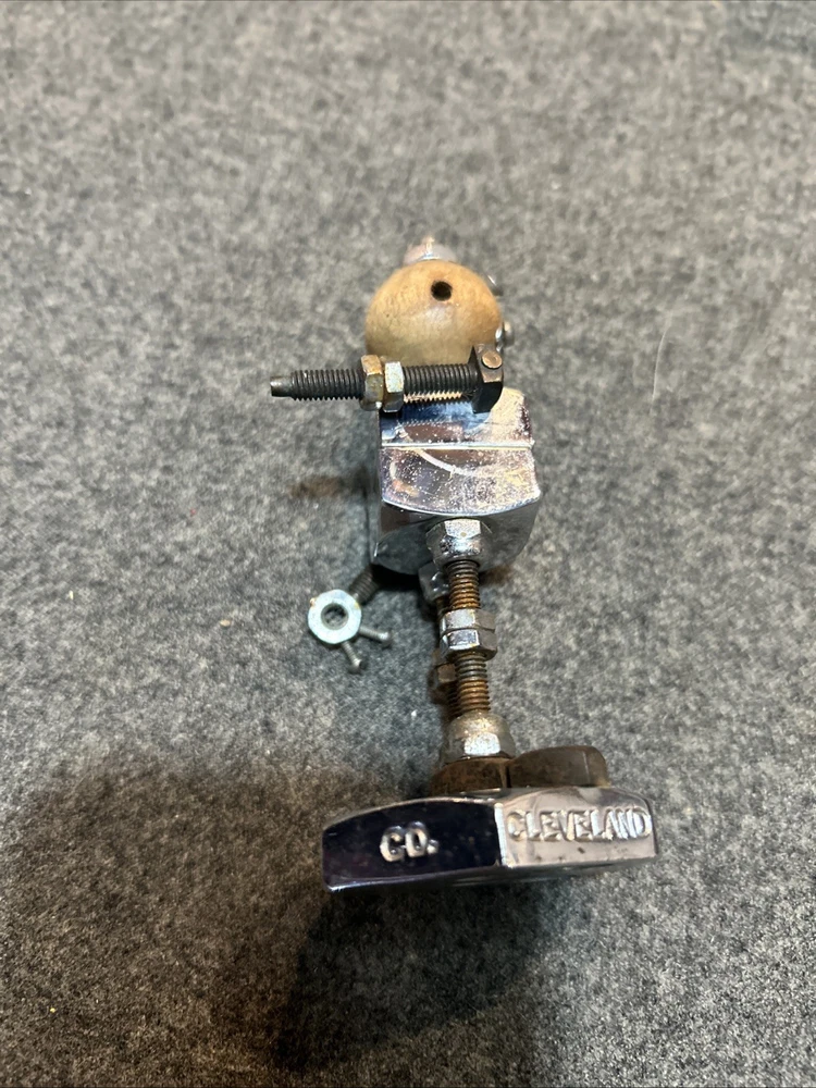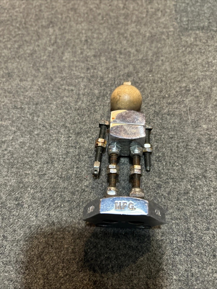 Great looking folk art advertising robot. Missing right hand, some fingers on left and wing nut ears. Little dusty between feet need a lil q-tip action with denatured alcohol. Light surface rust on chrome or nickel plate body transferred from hands at side. I recommend #0000 fine steel wool. I really wanted to dive in and tap a new hand and replace ears, but then I thought I’d be taking that enjoyment away from the new owner. Please send me a pic if you decide to do some work to him or even if you just decide to keep him as is. Next day shipping.