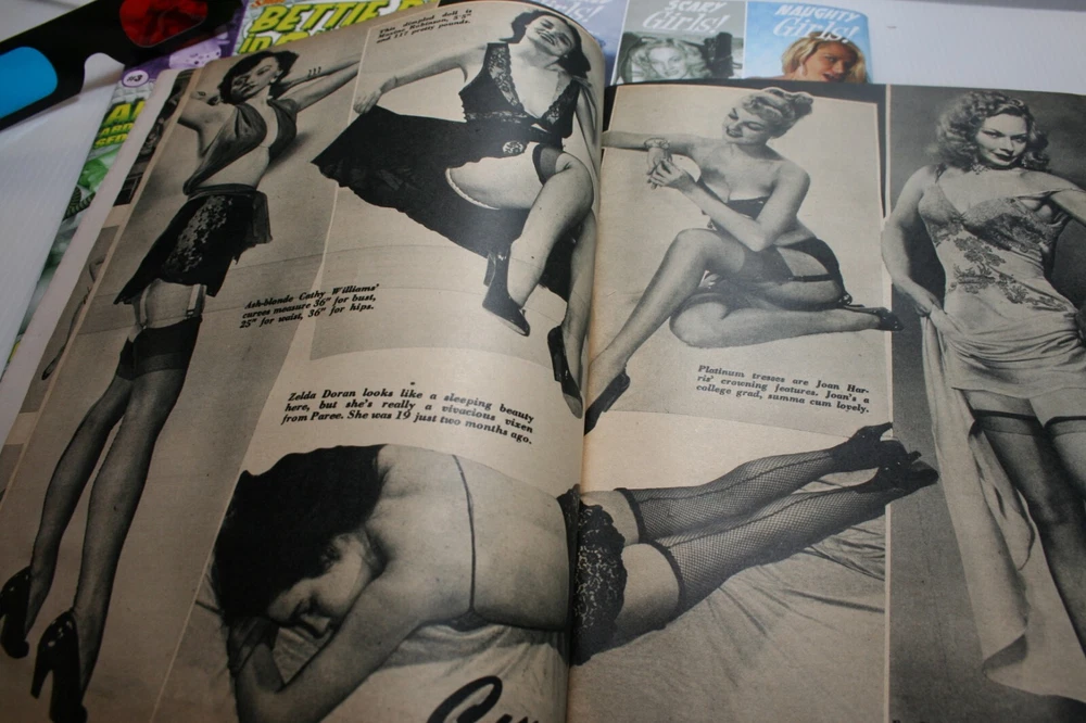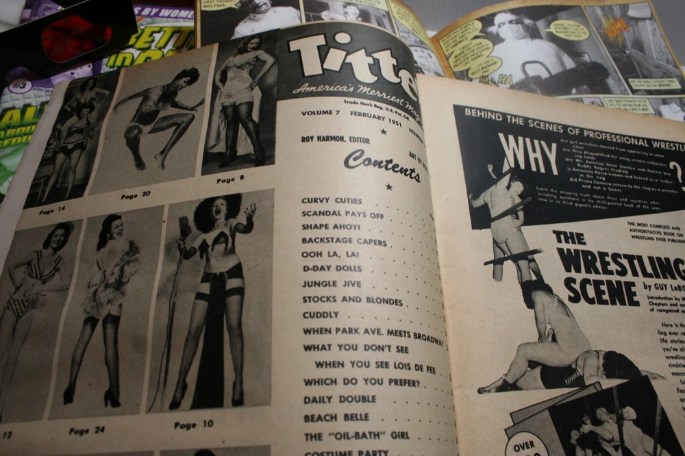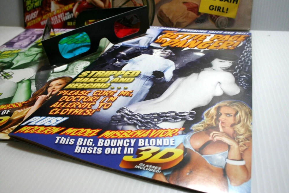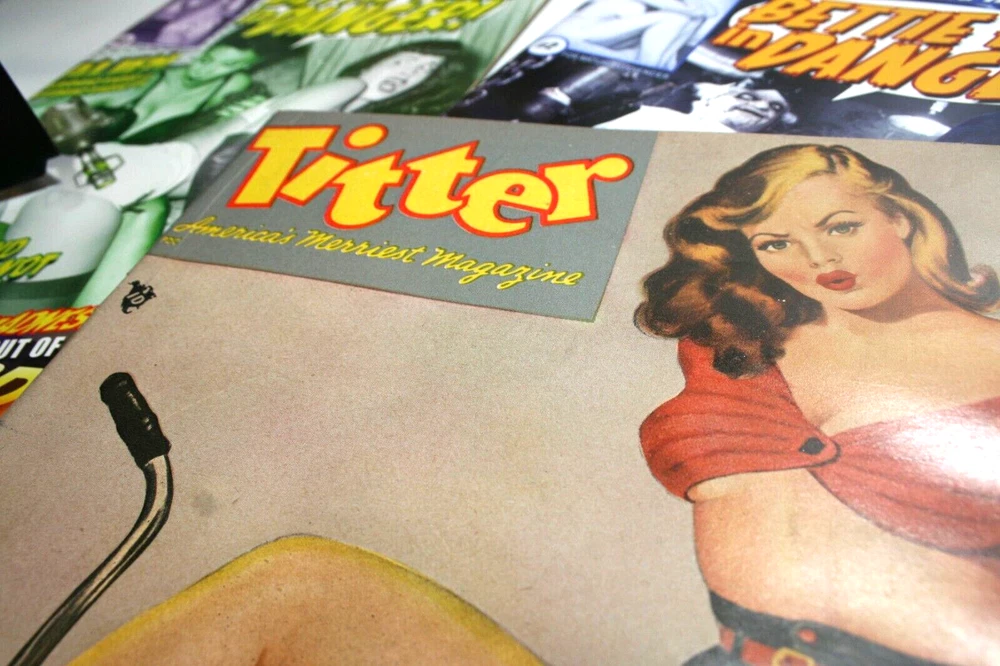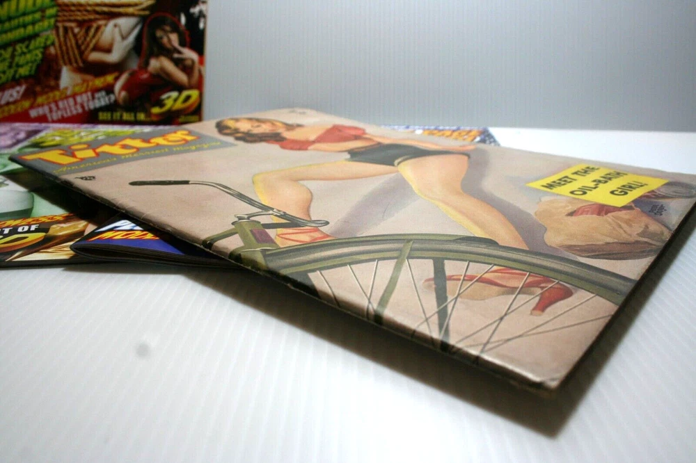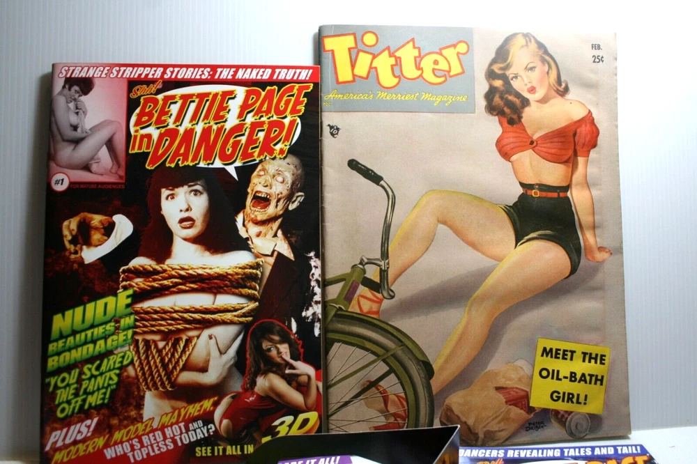 This vintage magazine titled "Titter" is a rare find for collectors of women's interest and men's entertainment. Its publication month was in February of 1951 and it is an English language monthly magazine. The magazine lot also features a photo comic book lot and Bettie Page, the famous pin-up model, graces its pages. The publication was made in the United States and is considered a 1st edition. It is a must-have for anyone interested in vintage magazines and books. It has a 3D photo spread in the back of each issue that is pretty cool. This item is perfect for collectors or those looking for a unique addition to their collection. Winning bidder gets all the books seen in the photos. Also, see our other auctions for more Bettie Page items and vintage pinup mags we are selling from a HUGE collection!