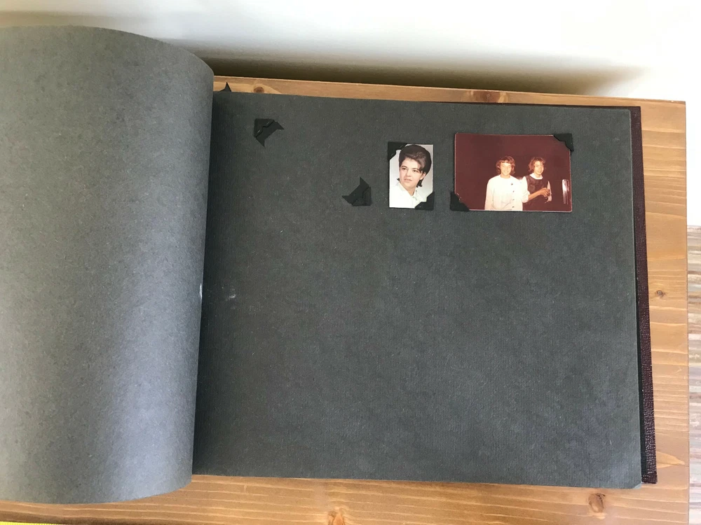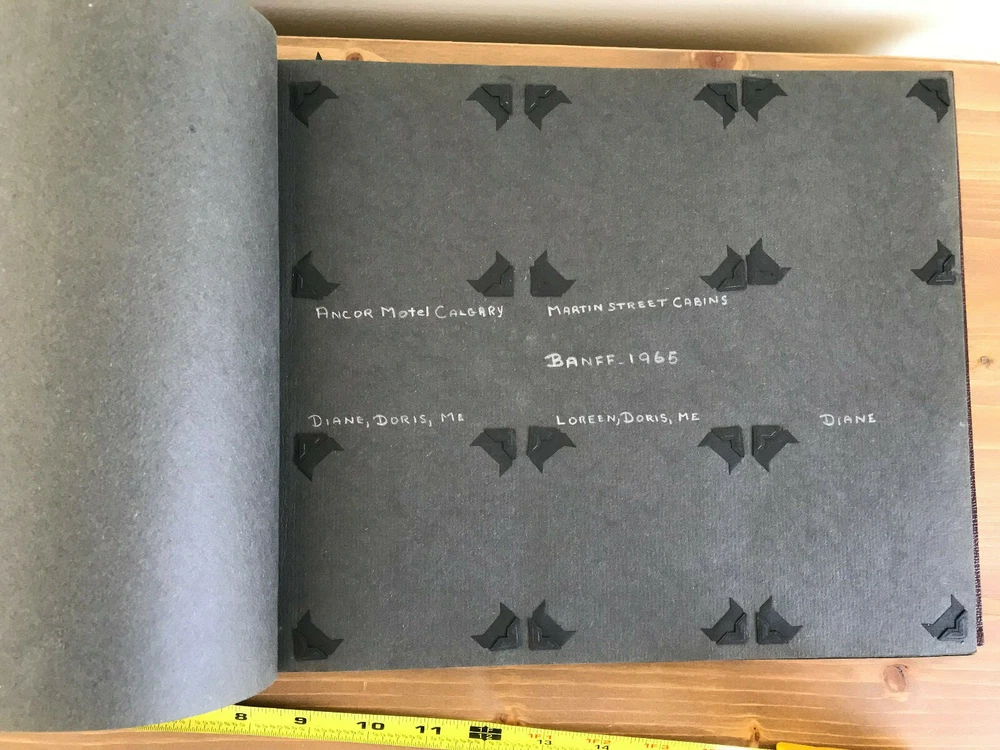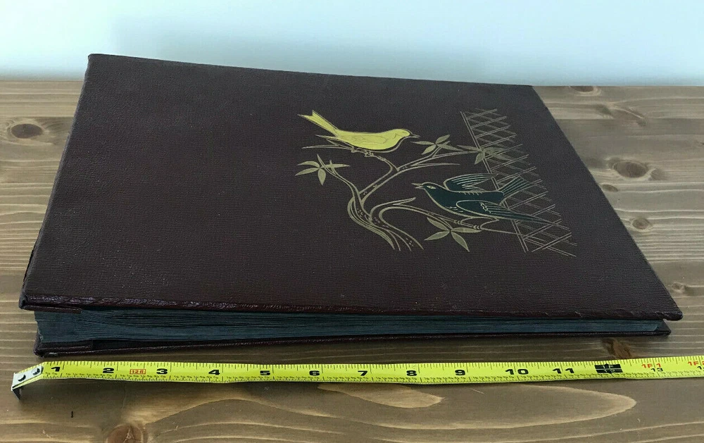 Vintage scrapbook from the 1960s has burgundy faux leather cover with bird design on the front. Pre-owned: has handwritten message inside front cover, photo corners and/or handwriting on 16 pages, and 2 old photos. There are 21 unused pages. This is a 2-post album, pages can be removed if desired. Cover measures 13 1/2" x 10 1/4", pages are 13" x 10". The pictures show the actual item that you will receive. Ships from Alberta, Canada. Tax applies to purchases.