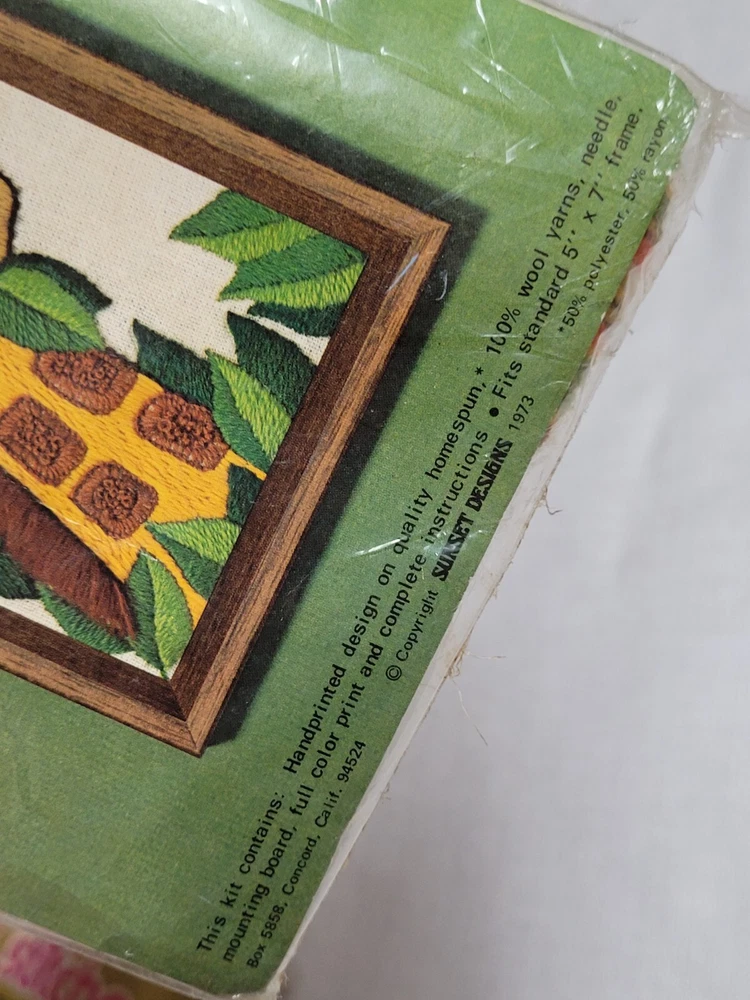 Vintage 1970s Sunset Designs Jiffy Stitchery Kit 413 PATCHES THE GIRAFFE 5x7 Kit contains yarn, needle , mounting board and instructions fits 5x7 frame -not included Estate find. Sealed See pics for complete description. Actual Color may vary in pics from flash/lighting. Smoke free ships next business day M-F Return Policy :Your satisfaction is our utmost importance. Returns accepted. If you have any issues with your order, please contact our team within two days. If you contact us outside of this time-frame, please know that we may not be able to help resolve your issues. Return postage is the buyer?s responsibility. Item must be returned in condition is was received. SMOKE FREE and if item was sold as New, Item must be returned in NEW condition with tags still attached. Refund original purchase price only (buyer must pay all shipping cost )