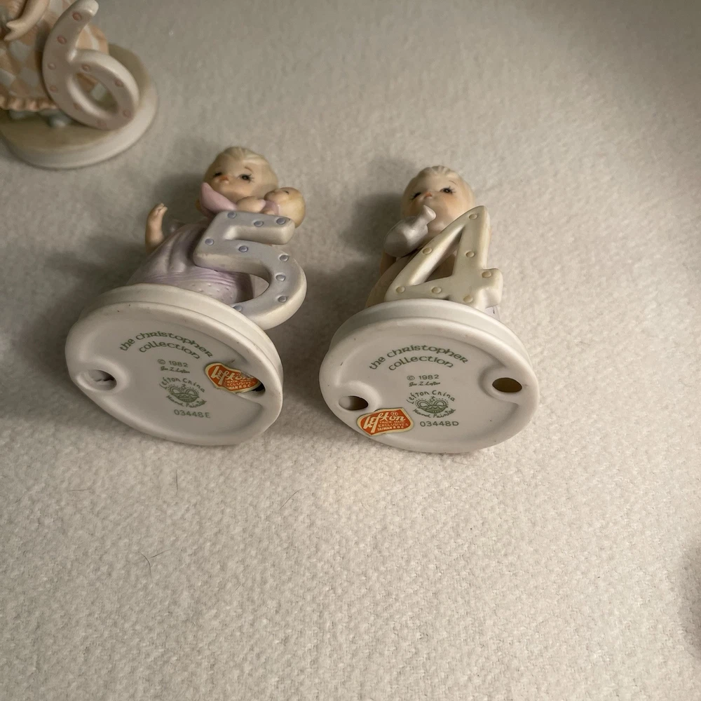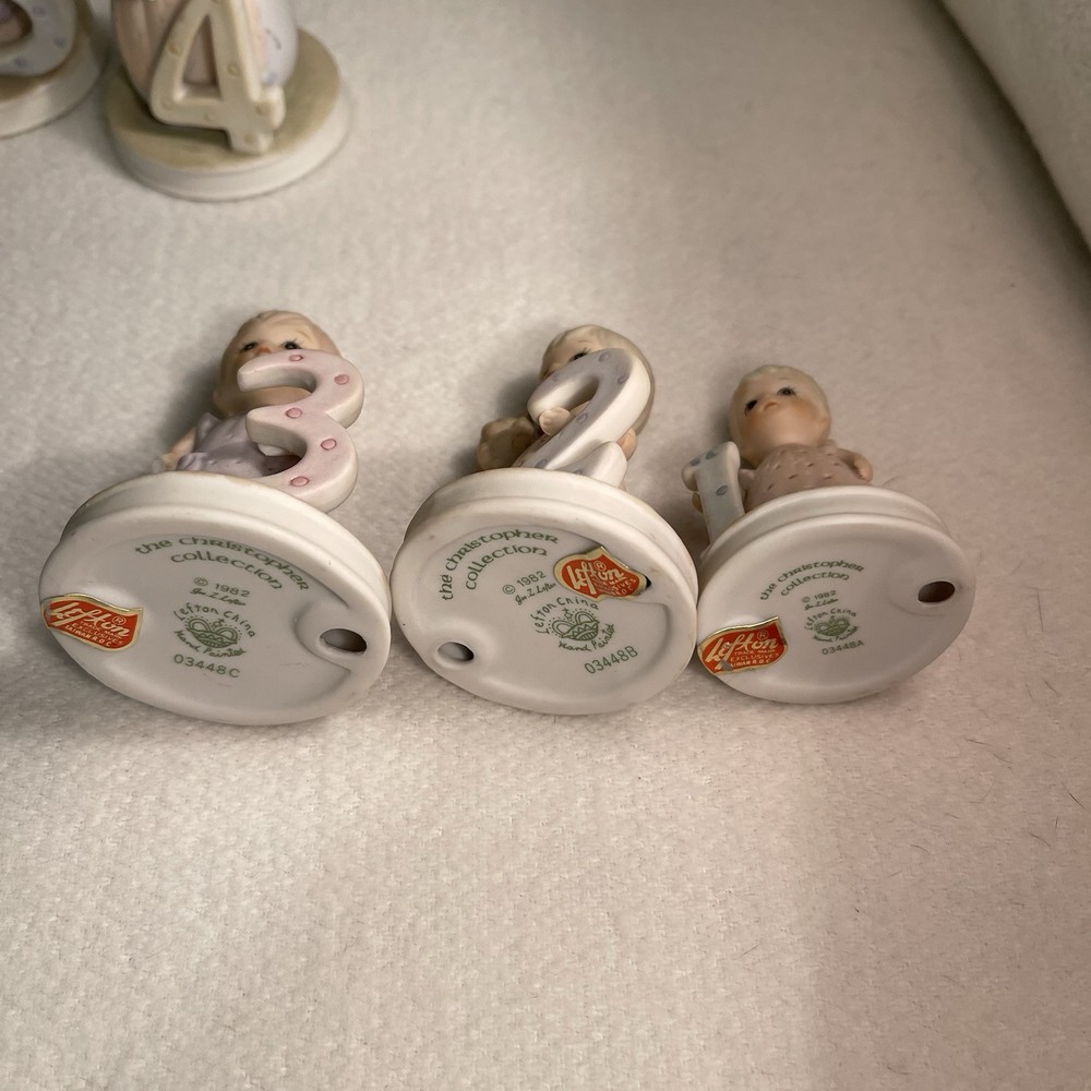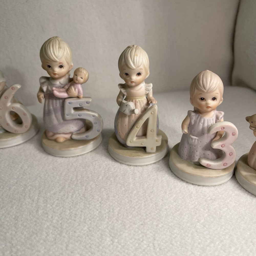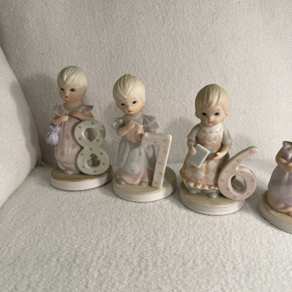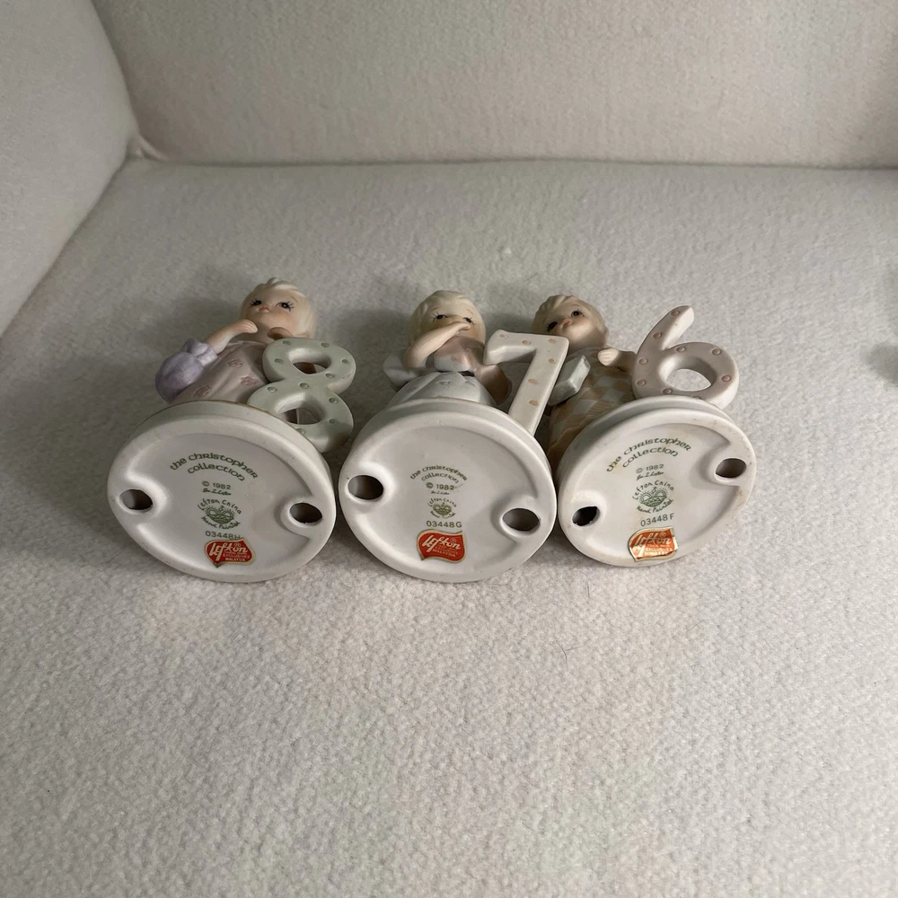 This vintage 1982 Lefton China Christopher Collection features a lot of 1-8 year girl figurines. Made of porcelain and hand-painted, these assorted multicolor figurines depict girls in various stages of growing up. Each figurine in the set represents a different age from 1 to 8 years old and is part of the "Growing Up Girls" collection from the 1980s. With a matte finish, these original figurines from China weigh 1.4 lbs and are a charming addition to any collection or decor. Mint condition. All new with tags.