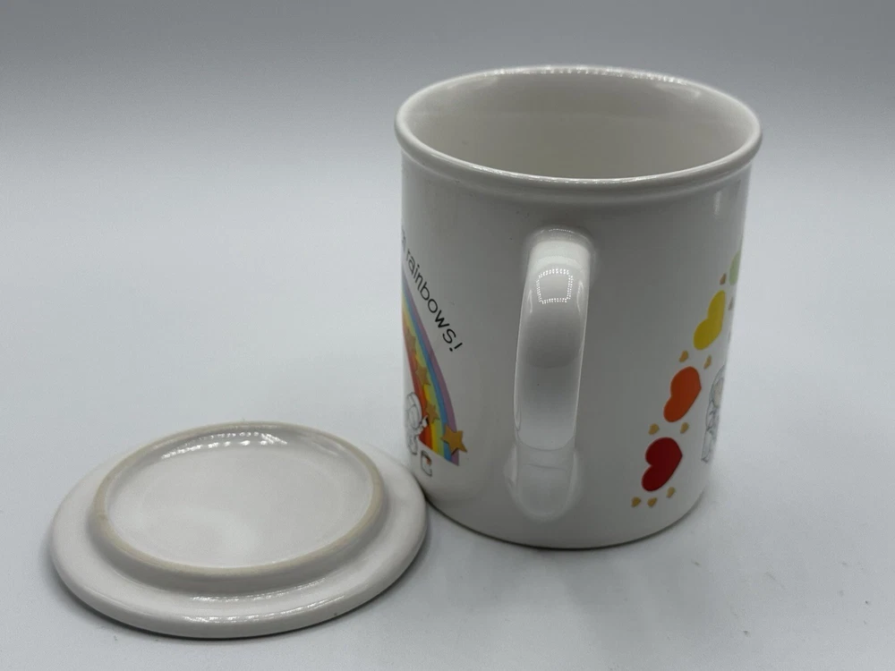 This vintage 1983 Hallmark Mug Mates coffee mug set is a must-have for any collector or fan of the 1980s. The colorful rainbow pattern and round shape of the mug make it perfect for hot or cold beverages, and the small size is great for teens or girls. The set includes a mug and lid/coaster, both made of porcelain with a painted design. The Mug Mates design features a handle and is an original piece from Japan. This mug set is perfect for all occasions and adds a touch of pride theme to your collection. Don't miss out on this rare find from the 1980s.